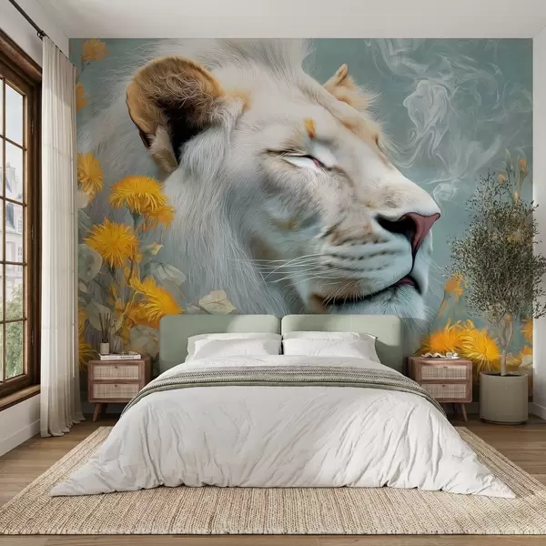 Murais de parede Um leão branco rodeado de flores amarelas e fumo Nr. w09080