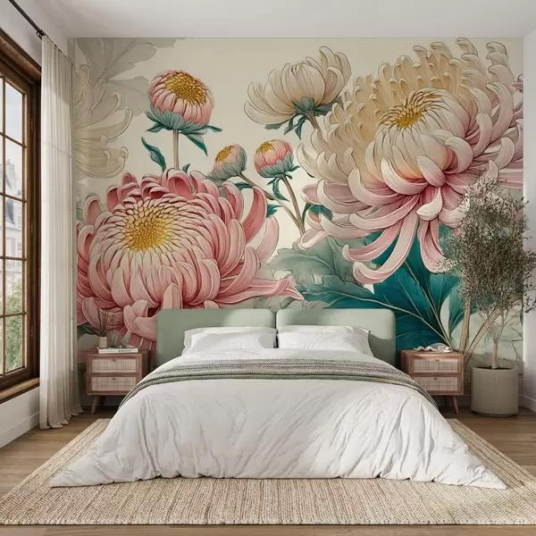 murais de parede Pintura intrincada de crisântemos brancos e cor-de-rosa w09081