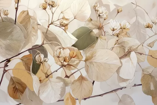 Murais de parede Ramos de folhas e flores de choupo em estilo de pintura a óleo em tons de bege Nr. w09082