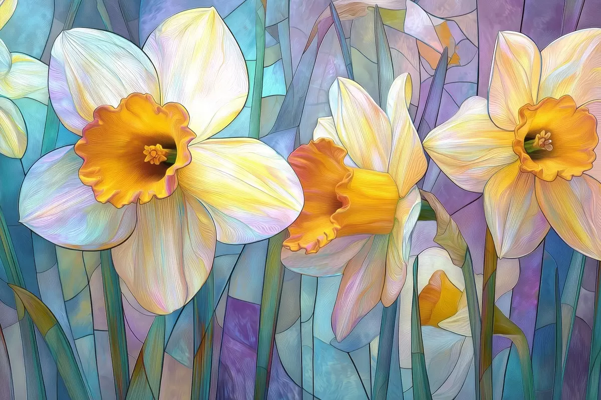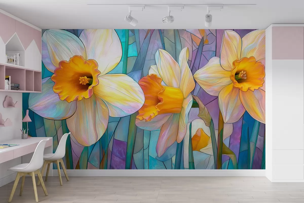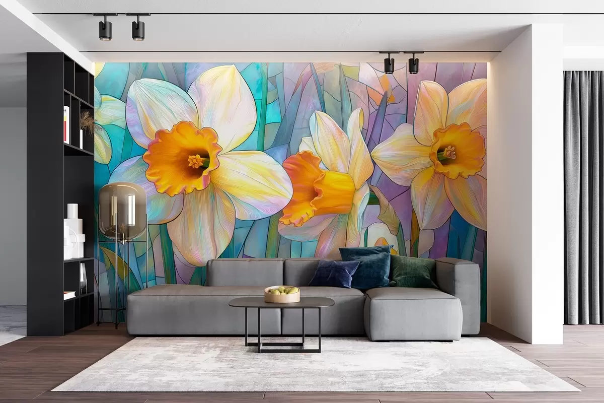 Murais de parede Narcisos coloridos num fundo de vidro colorido azul-violeta Nr. w09092