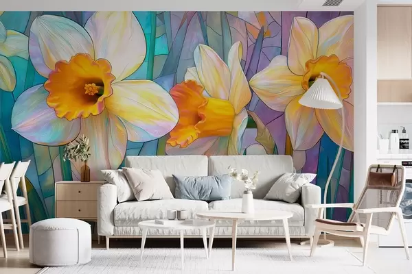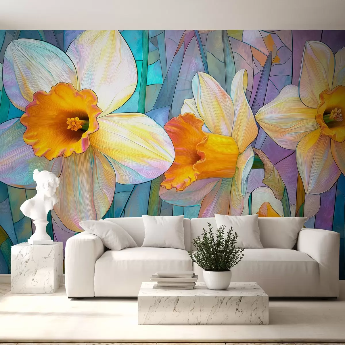 Murais de parede Narcisos coloridos num fundo de vidro colorido azul-violeta Nr. w09092