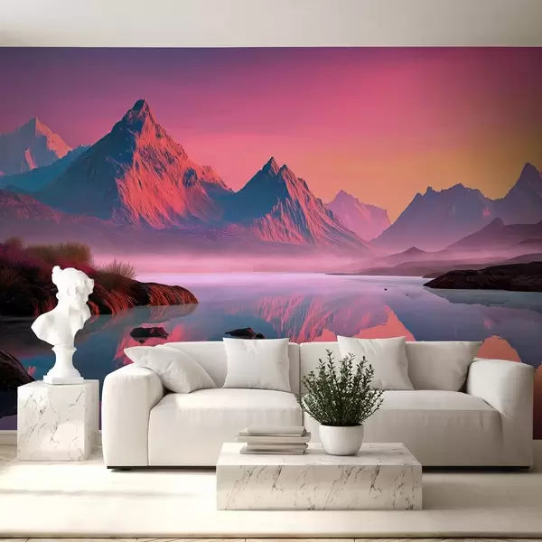 Murais de parede Paisagem romântica ao pôr do sol com um rio e montanhas em tons de rosa Nr. w09093