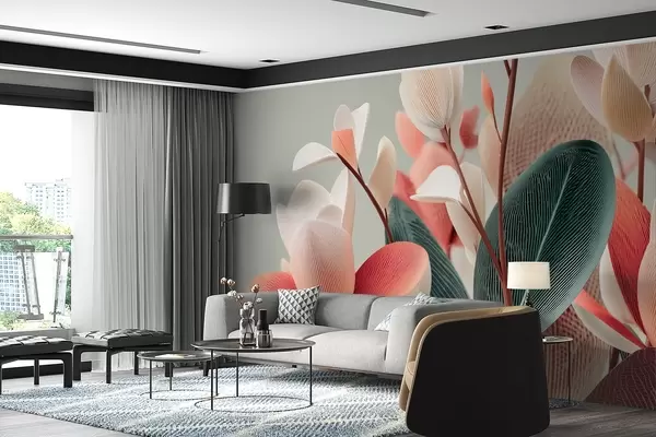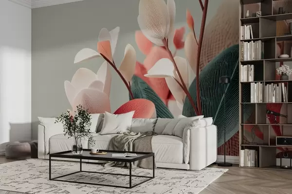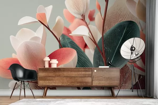 Murais de parede Flores e folhas com textura em tons pastel e verdes Nr. w09094