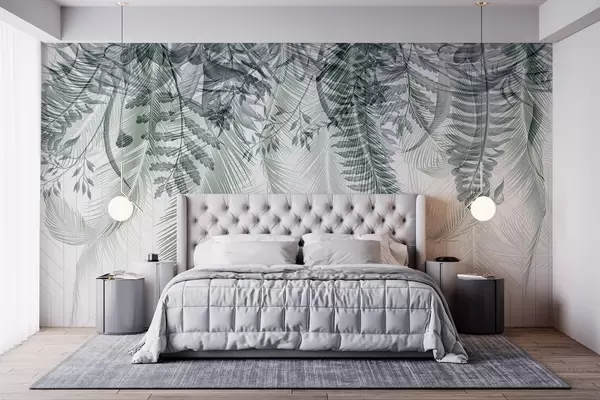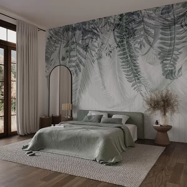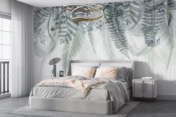 Murais de parede Delicada queda de fetos tropicais e folhas de palmeira, fundo geométrico, luz suave, cores suaves, elegante Nr. w09106