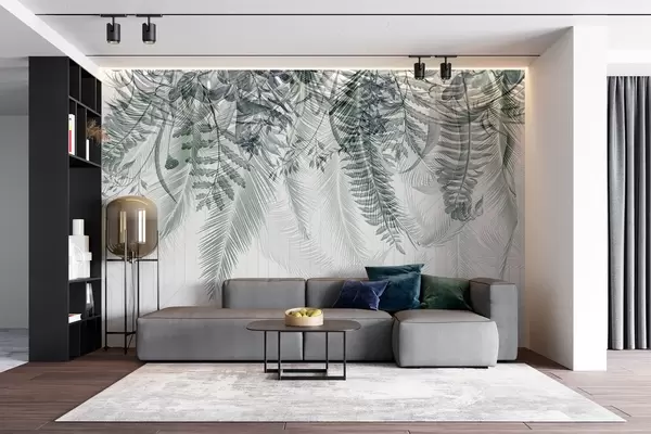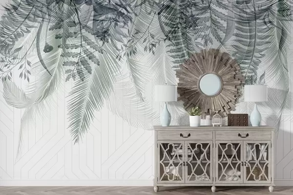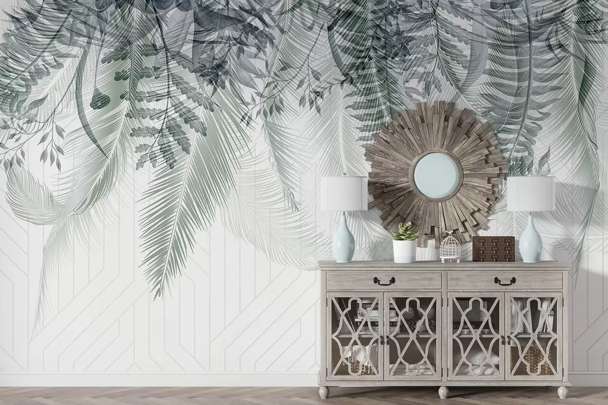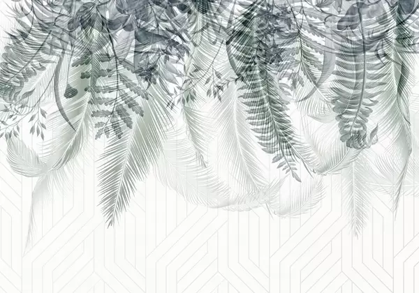 Murais de parede Delicada queda de fetos tropicais e folhas de palmeira, fundo geométrico, luz suave, cores suaves, elegante Nr. w09106