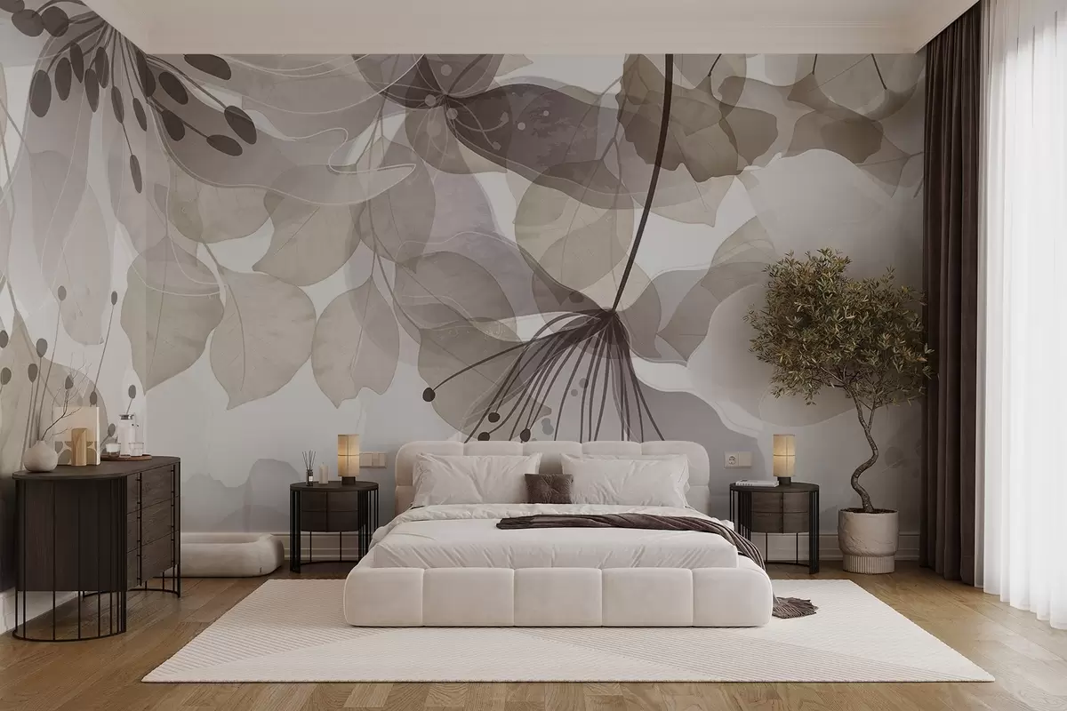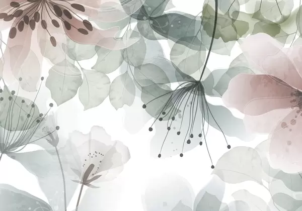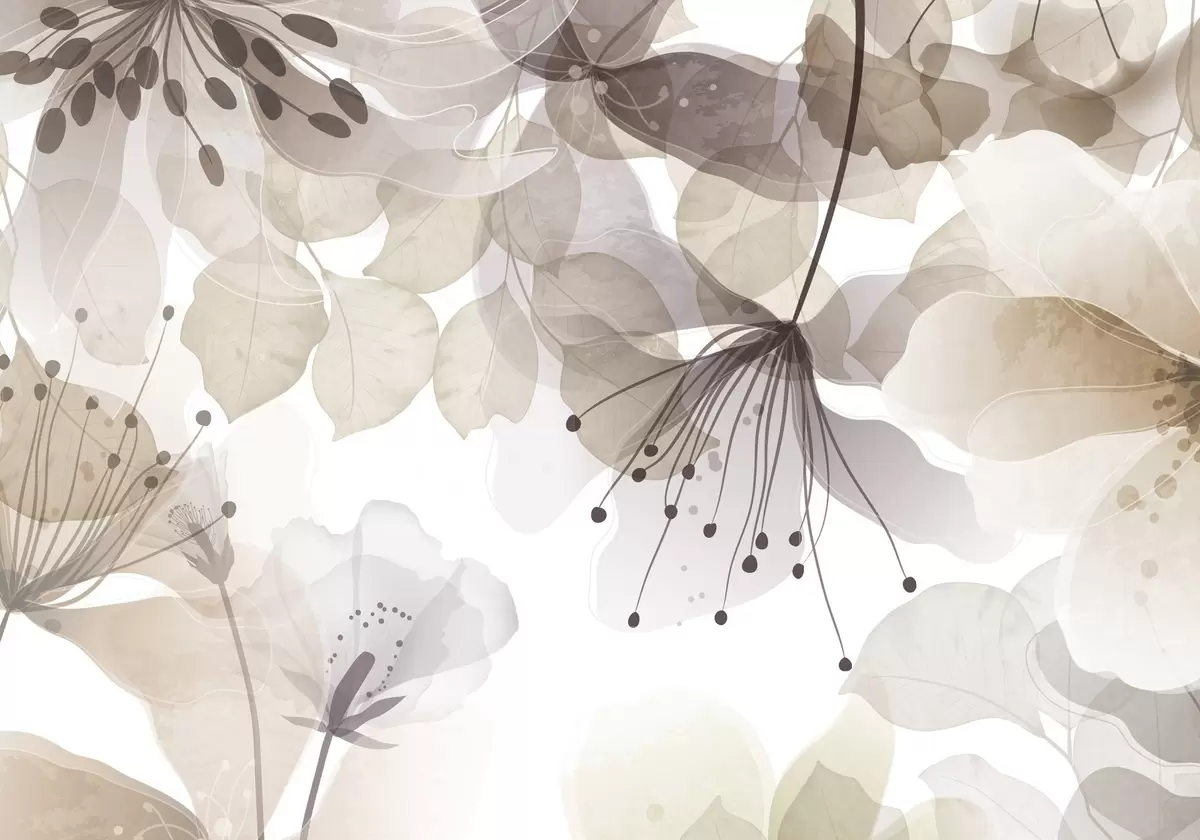 Murais de parede Flores e folhas em tons de bege, pétalas e folhas translúcidas, efeito suave de aguarela, linhas delicadas, fundo branco Nr. w09107v1