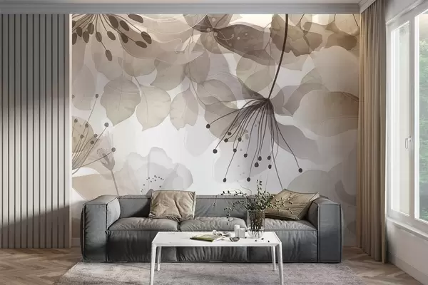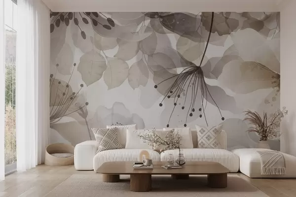 Murais de parede Flores e folhas em tons de bege, pétalas e folhas translúcidas, efeito suave de aguarela, linhas delicadas, fundo branco Nr. w09107v1