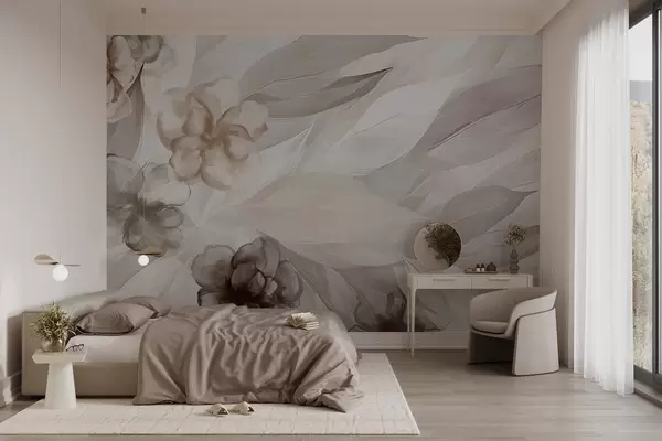 Murais de parede Flores e folhas delicadas em tons de branco, castanho e bege, fundo floral, cores suaves, pétalas delicadas Nr. w09111v1
