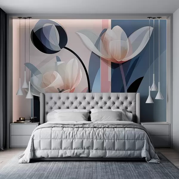 Murais de parede Desenho moderno abstrato com tulipas com pétalas transparentes em tons pastel de rosa, branco e azul escuro Nr. w09116