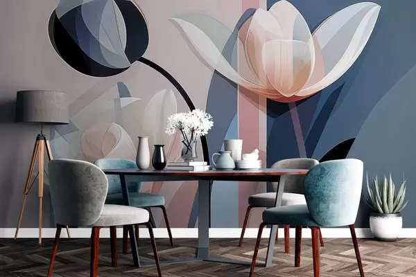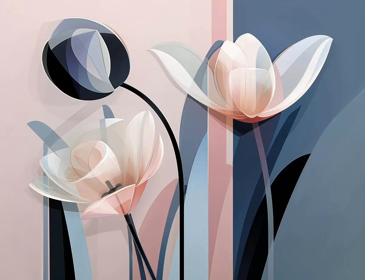 Murais de parede Desenho moderno abstrato com tulipas com pétalas transparentes em tons pastel de rosa, branco e azul escuro Nr. w09116