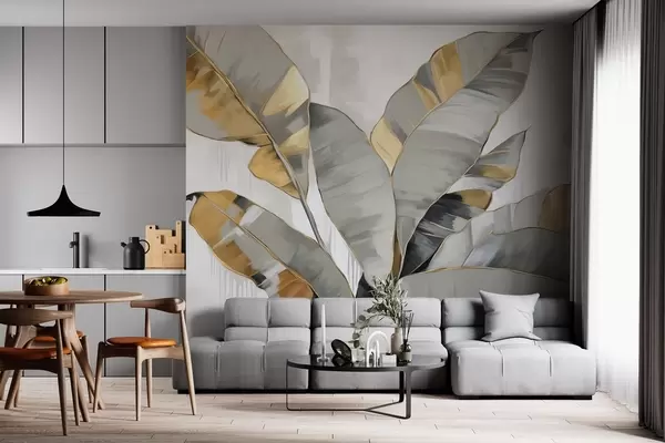 Murais de parede Folhas texturizadas de bananeira tropical com tons de cinzento e amarelo, estilo moderno, fundo neutro, pintura decorativa Nr. w09118