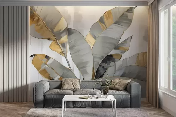 Murais de parede Folhas texturizadas de bananeira tropical com tons de cinzento e amarelo, estilo moderno, fundo neutro, pintura decorativa Nr. w09118