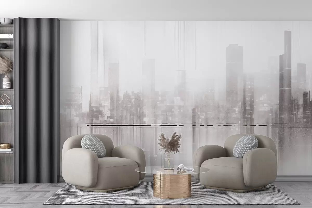 Murais de parede Paisagem urbana abstrata texturada com edifícios altos e faixas, em tons de cinzento e branco, criando um efeito nebuloso Nr. w09119