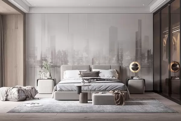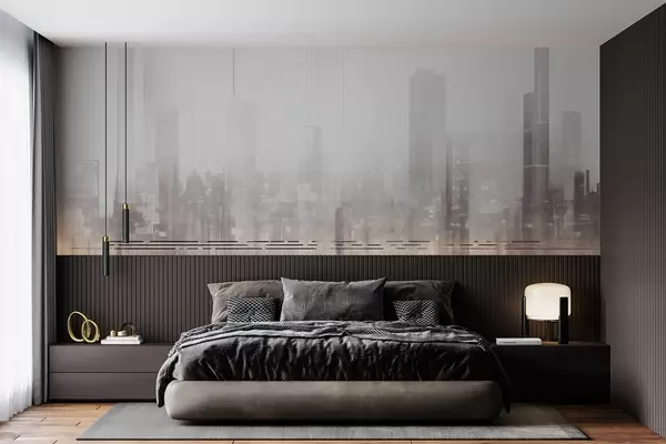 Murais de parede Paisagem urbana abstrata texturada com edifícios altos e faixas, em tons de cinzento e branco, criando um efeito nebuloso Nr. w09119