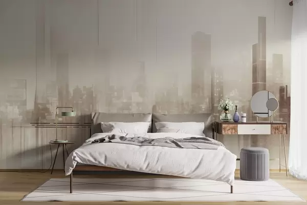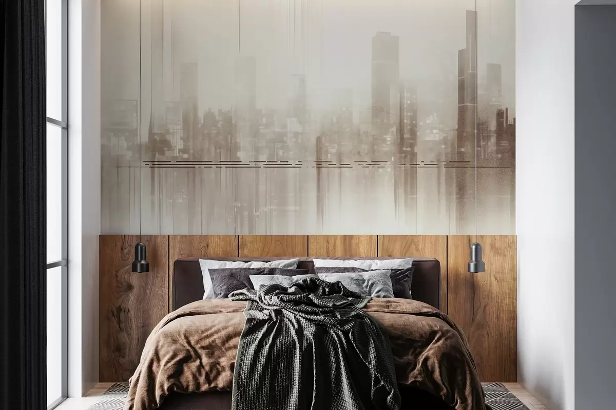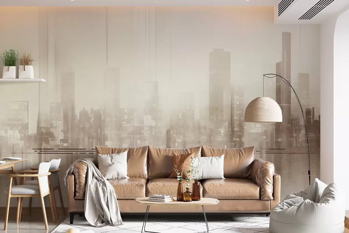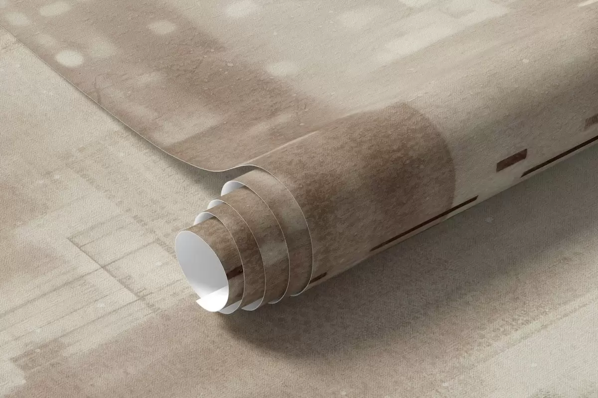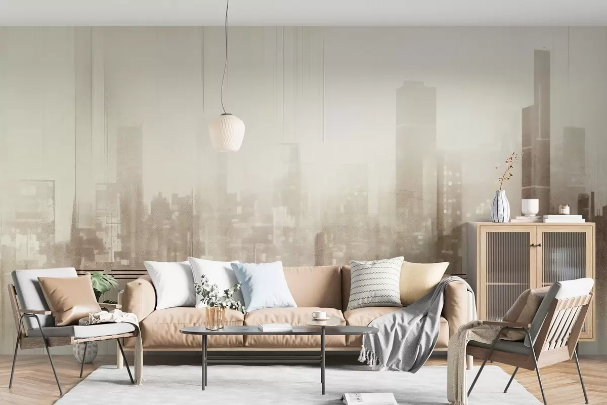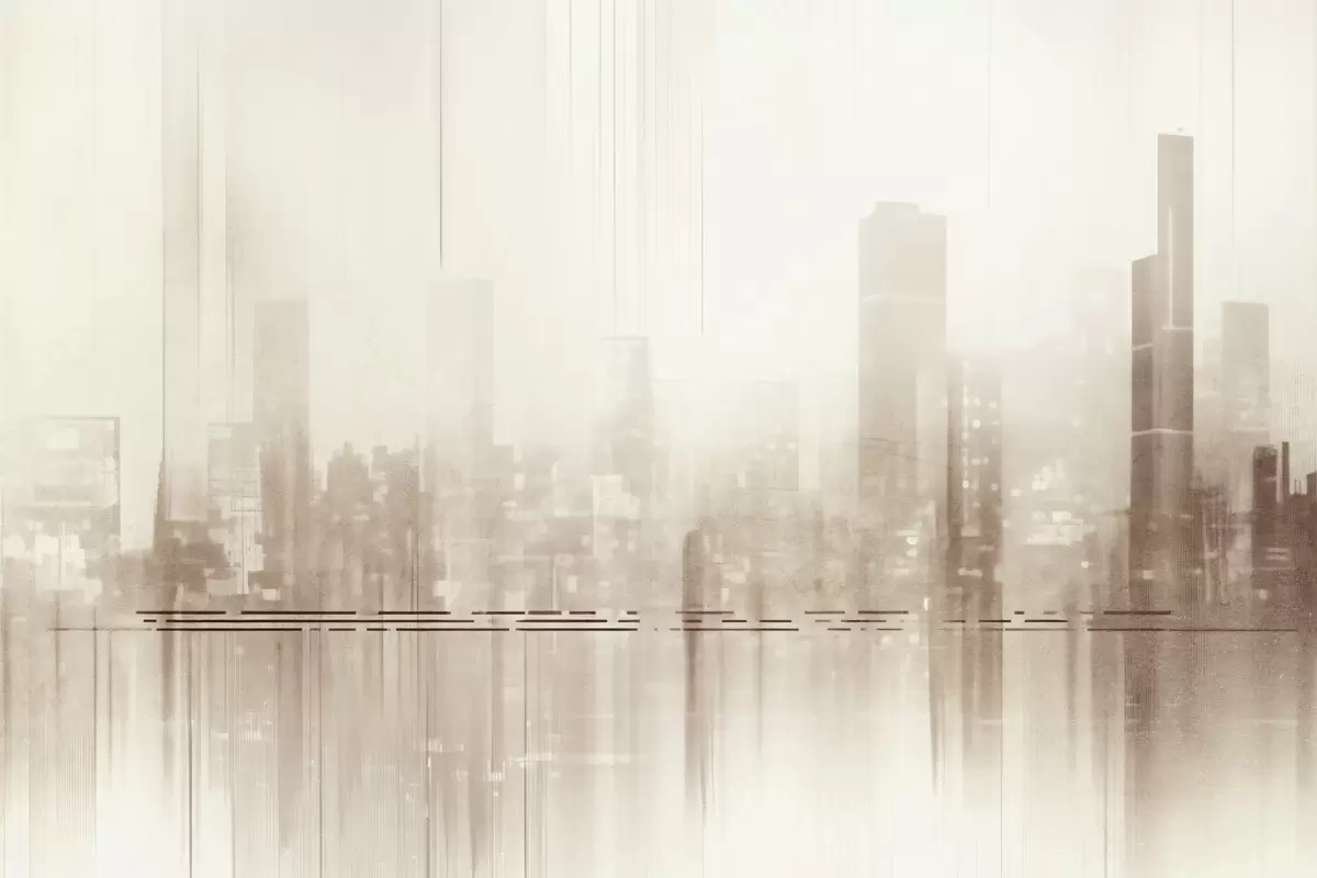 Murais de parede Paisagem urbana abstrata texturada com edifícios altos e faixas, em tons de bege e branco, criando um efeito nebuloso Nr. w09119v1