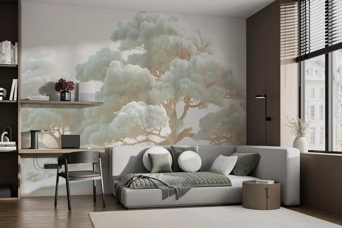 Murais de parede Pinheiros no nevoeiro em tons suaves numa floresta Nr. w09122