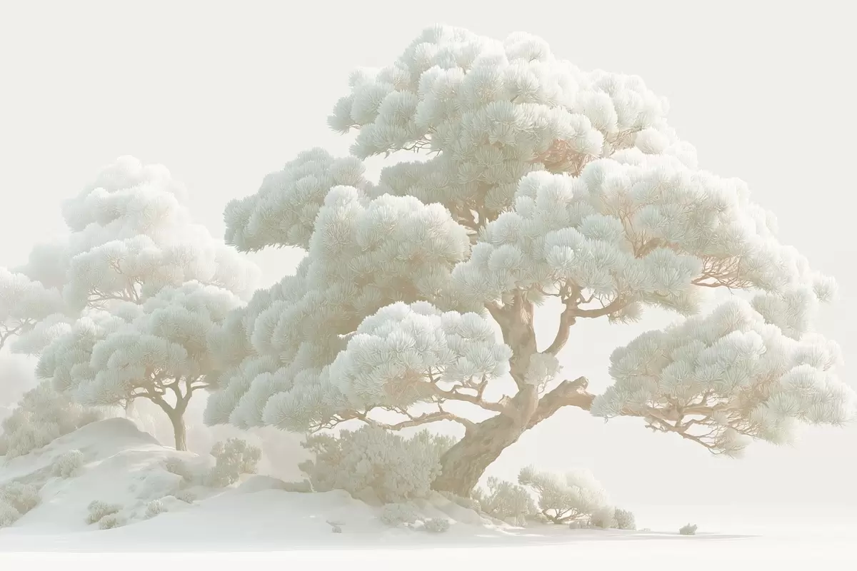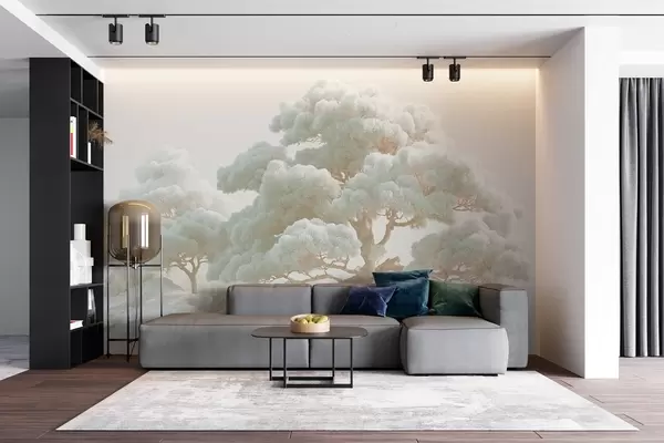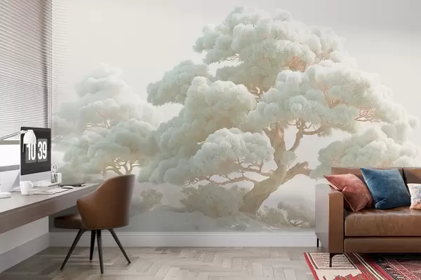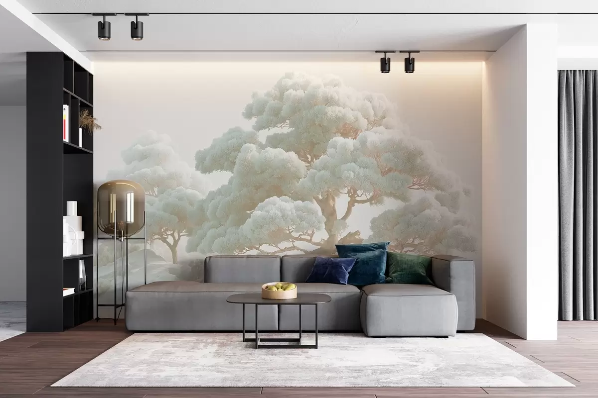 Murais de parede Pinheiros no nevoeiro em tons suaves numa floresta Nr. w09122