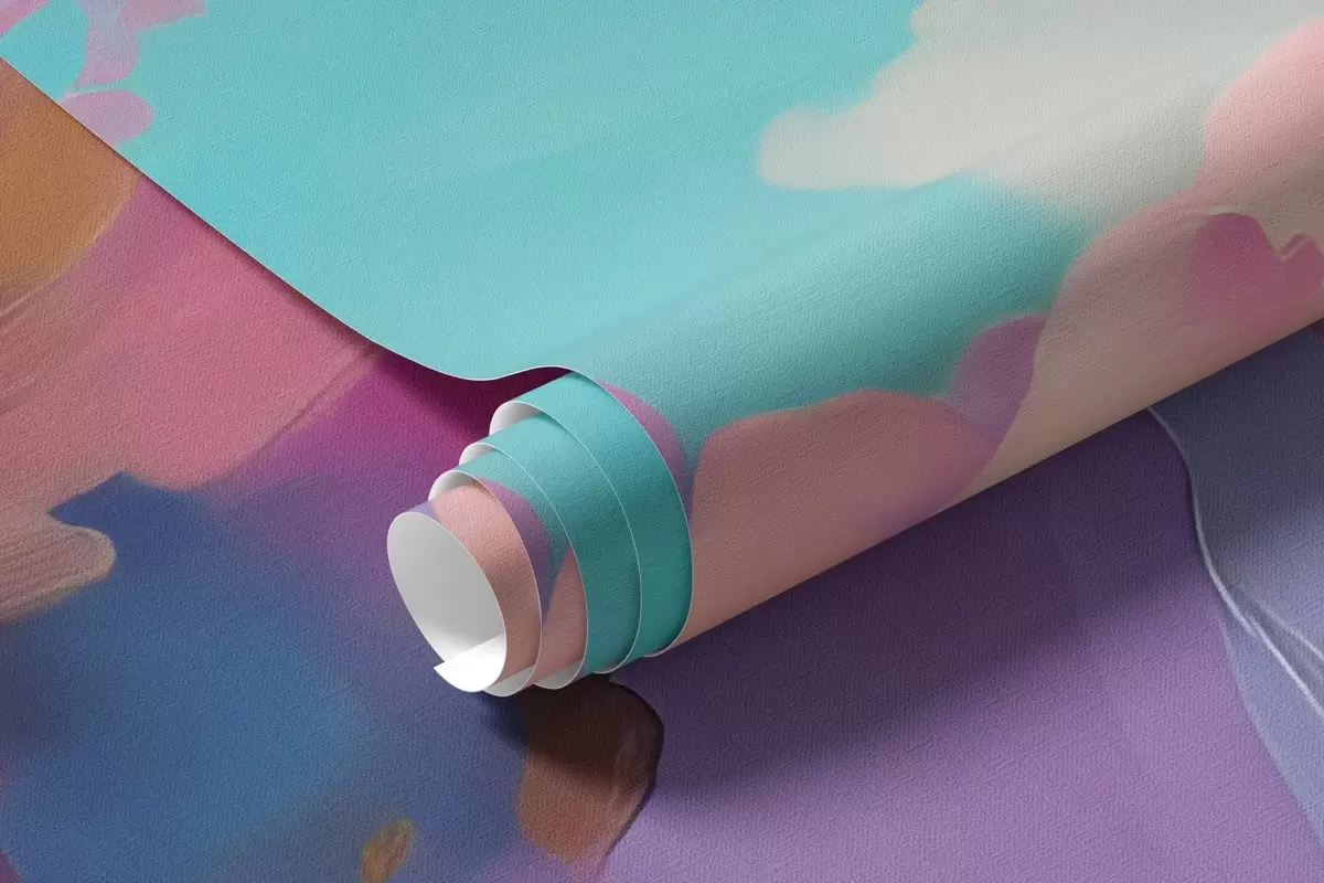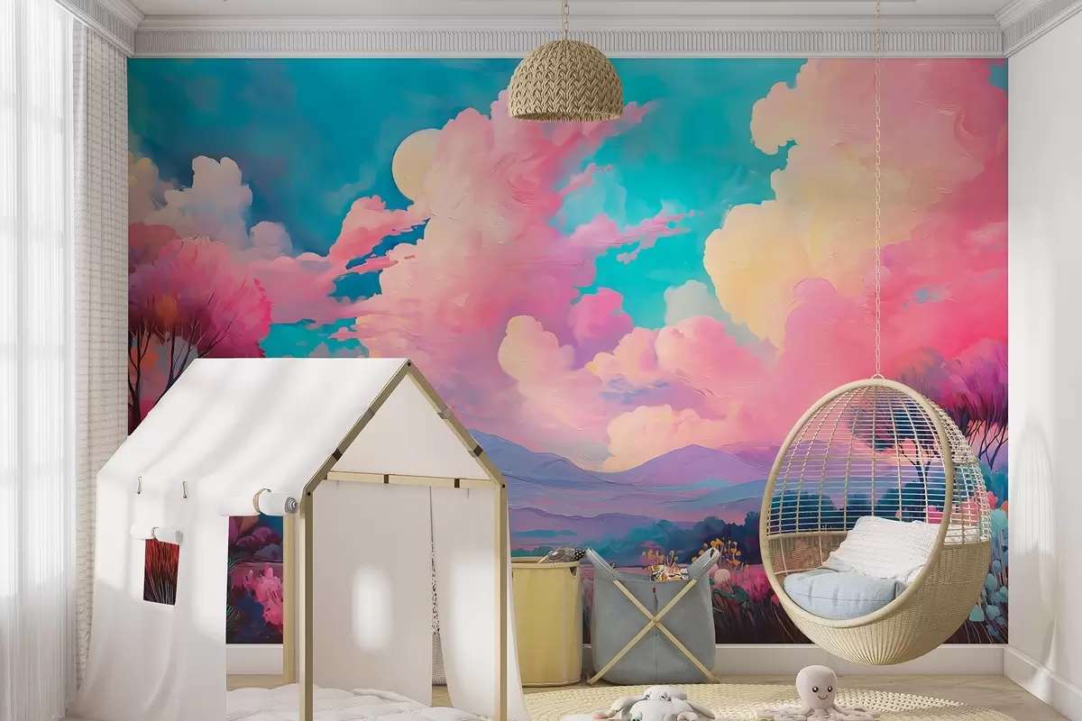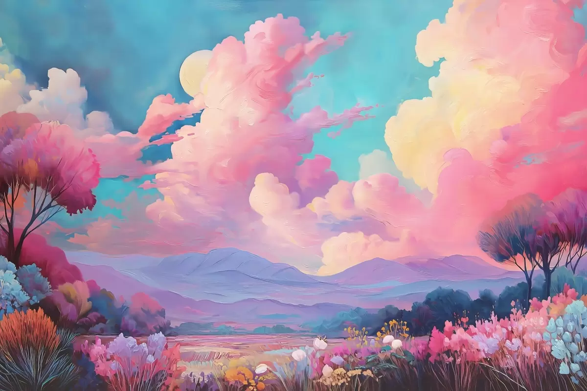 Murais de parede Paisagem colorida em estilo de pintura a óleo com um céu cor-de-rosa, plantas e árvores Nr. w09123