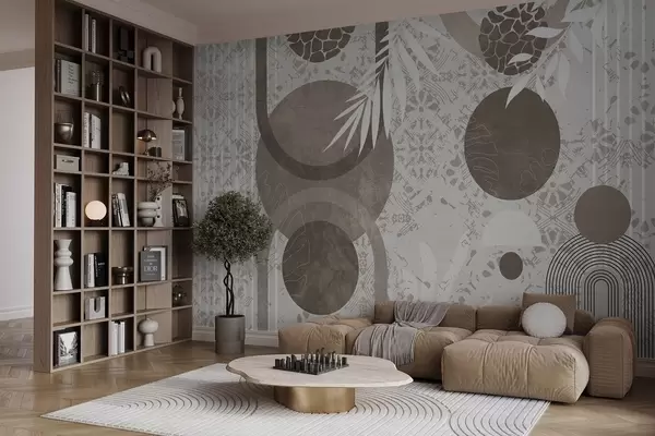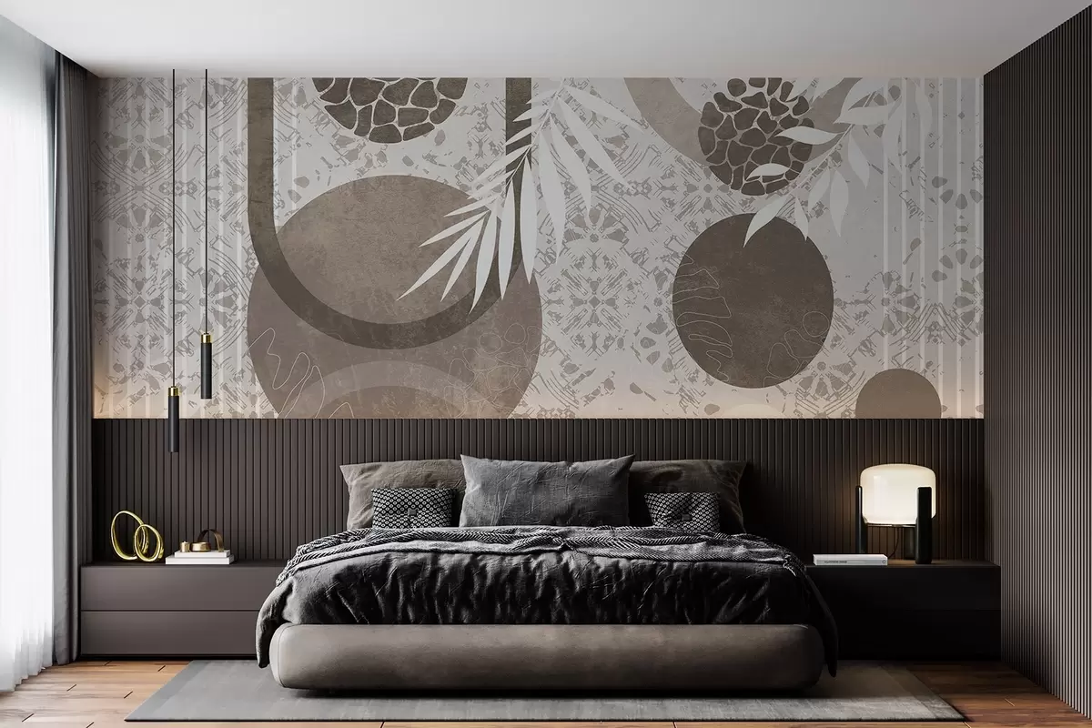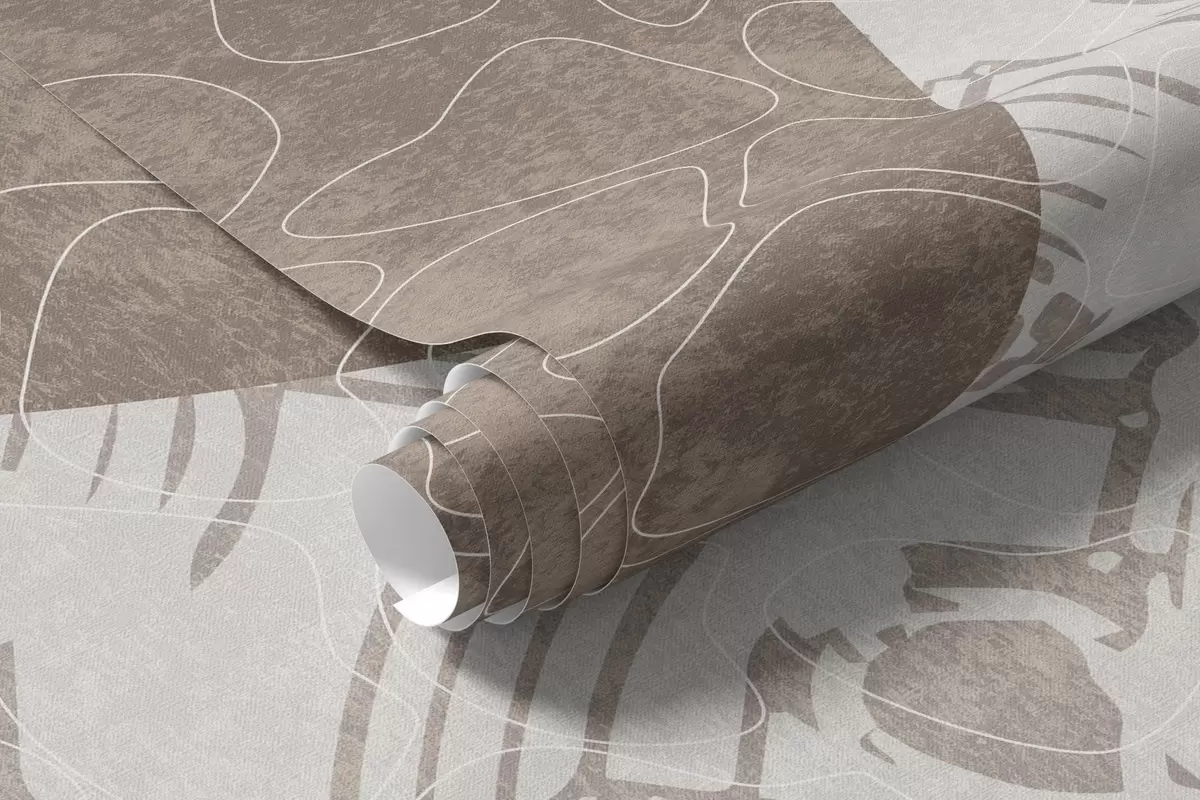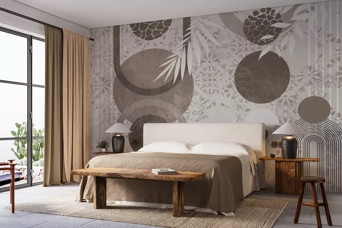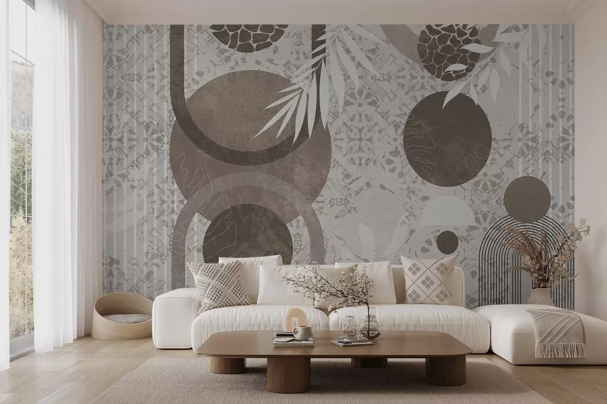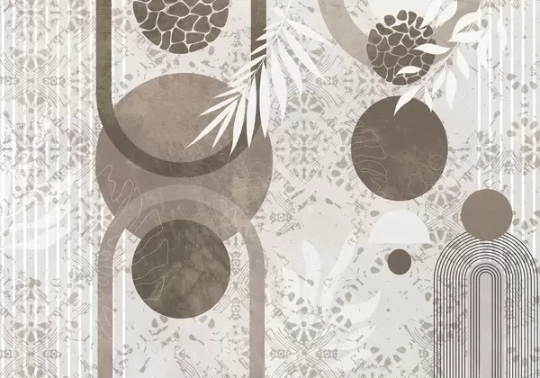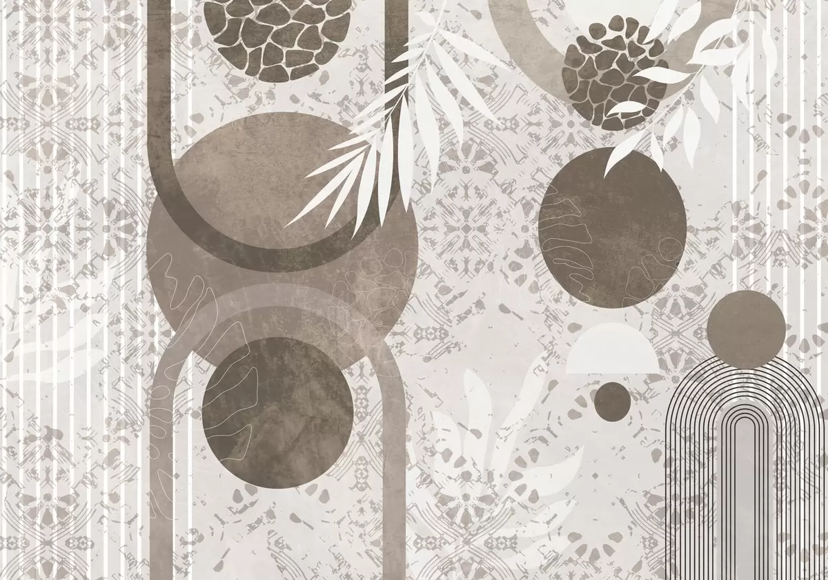 Murais de parede Formas geométricas abstractas e texturais em castanho e branco, círculos, arcos e elementos botânicos, design moderno e minimalista Nr. w09130