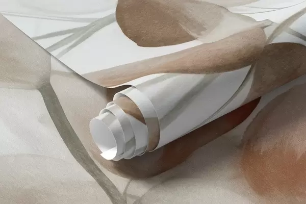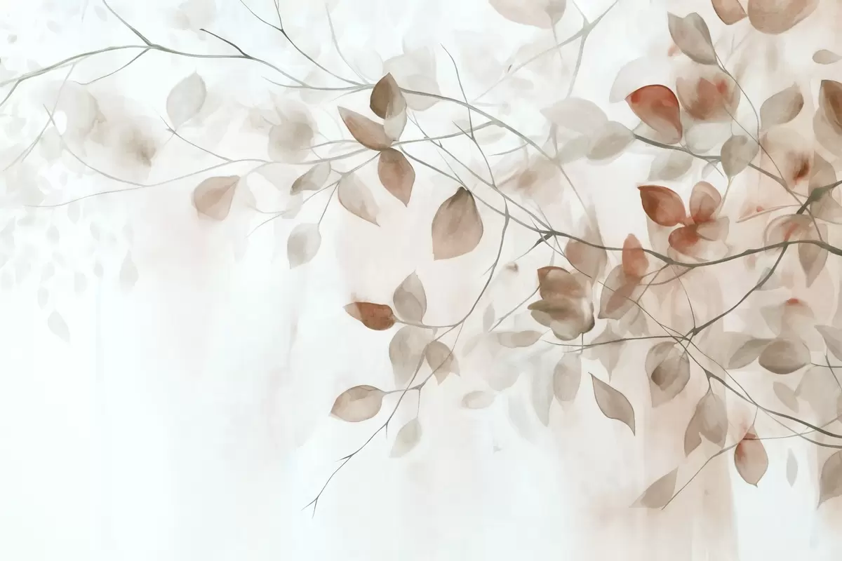 Murais de parede Pintura textural a aguarela imitação de folhas e ramos castanhos, cores suaves, pormenores delicados sobre um fundo branco Nr. w09133