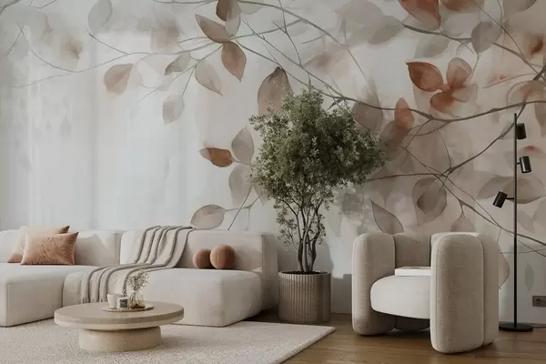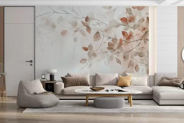 Murais de parede Pintura textural a aguarela imitação de folhas e ramos castanhos, cores suaves, pormenores delicados sobre um fundo branco Nr. w09133