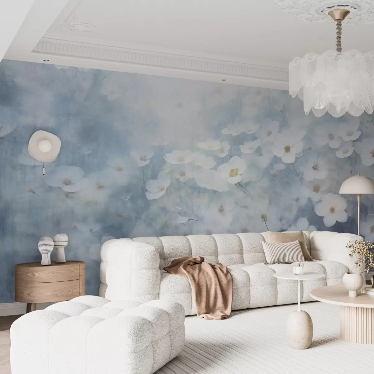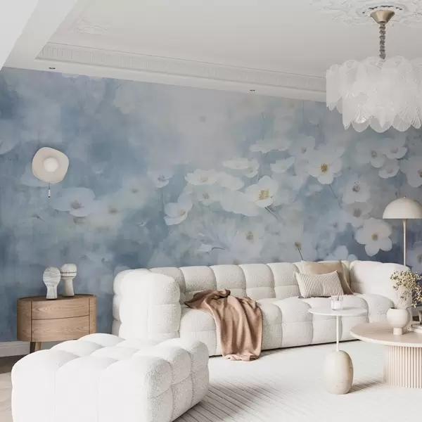 Murais de parede Campo textural de flores de anémonas brancas, focagem suave, atmosfera de sonho, paleta de cores azul claro e branco, prado primaveril Nr. w09134