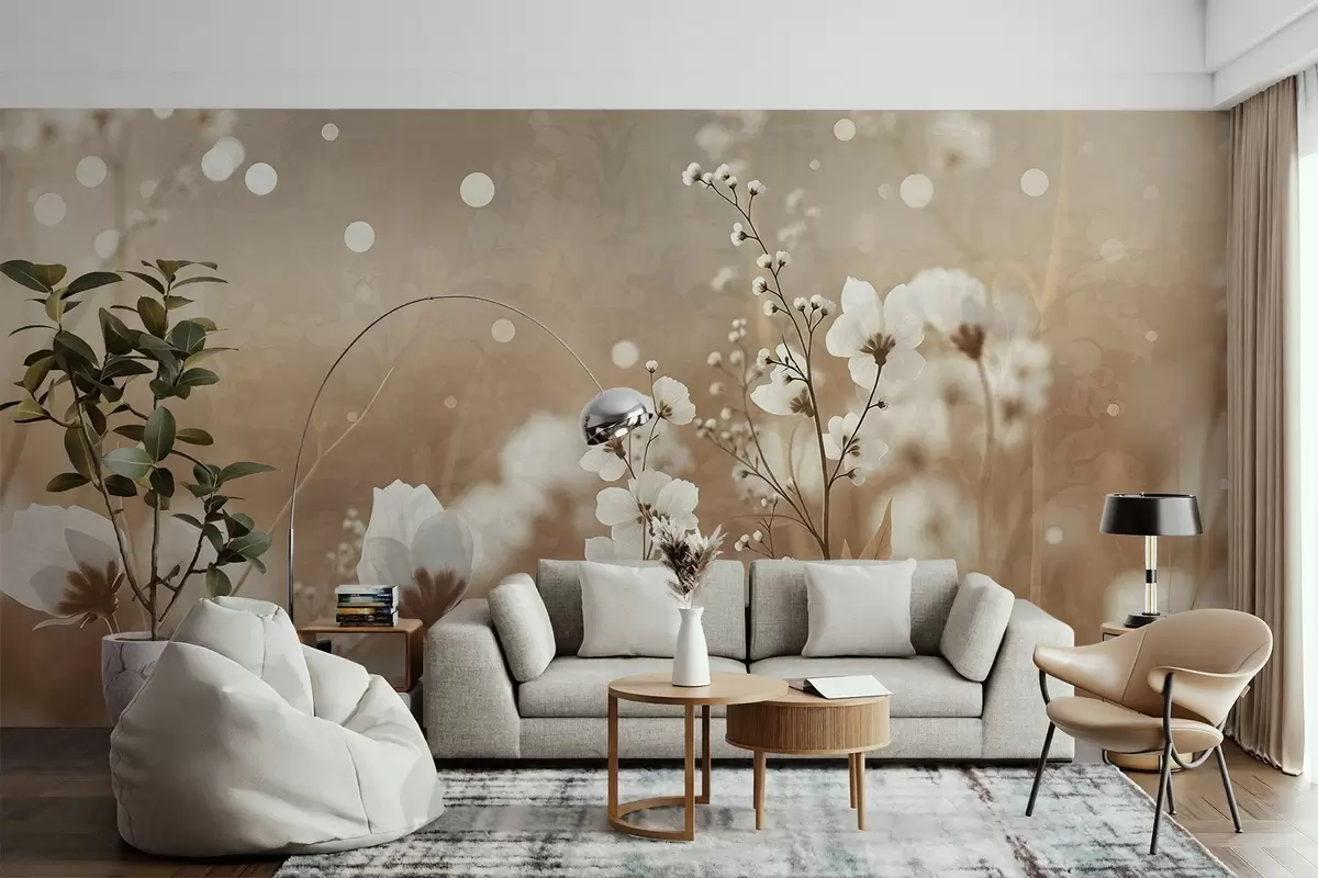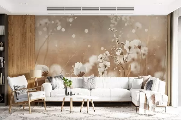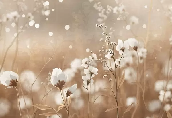 Murais de parede Flores brancas com caules e folhas castanhos num campo, efeito bokeh, paleta de cores quentes, obra de arte elegante inspirada na natureza Nr. w09135
