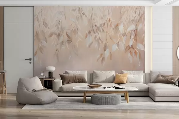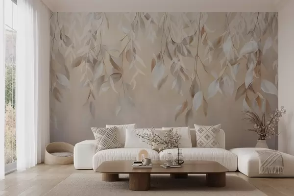 Murais de parede Folhas brancas e bege texturadas penduradas com uma paleta de cores suaves, pêssego, cinzento e fundo branco delicado Nr. w09136