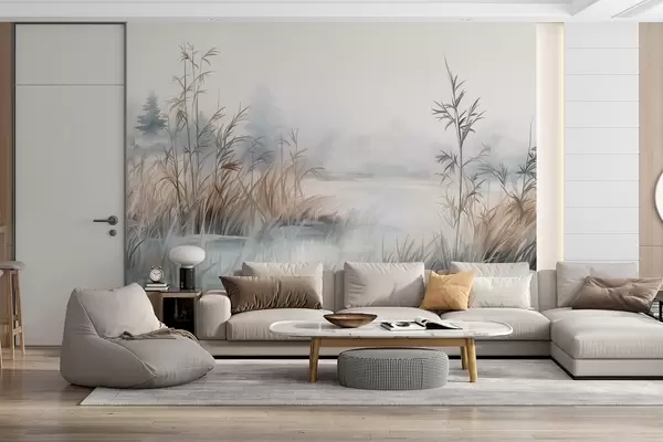 murais de parede Paisagem texturada de um lago com ervas altas em primeiro plano, azul e castanho suaves, água calma, árvores ao longe w09137