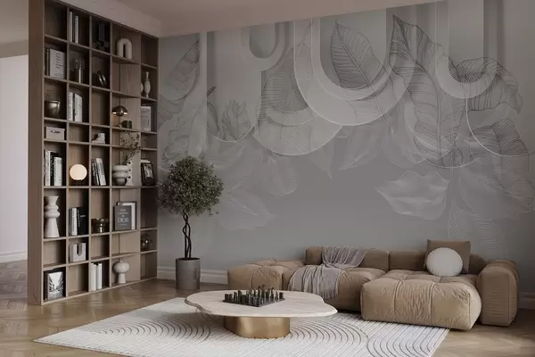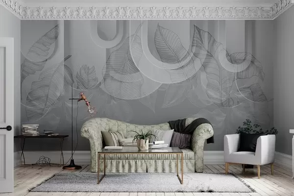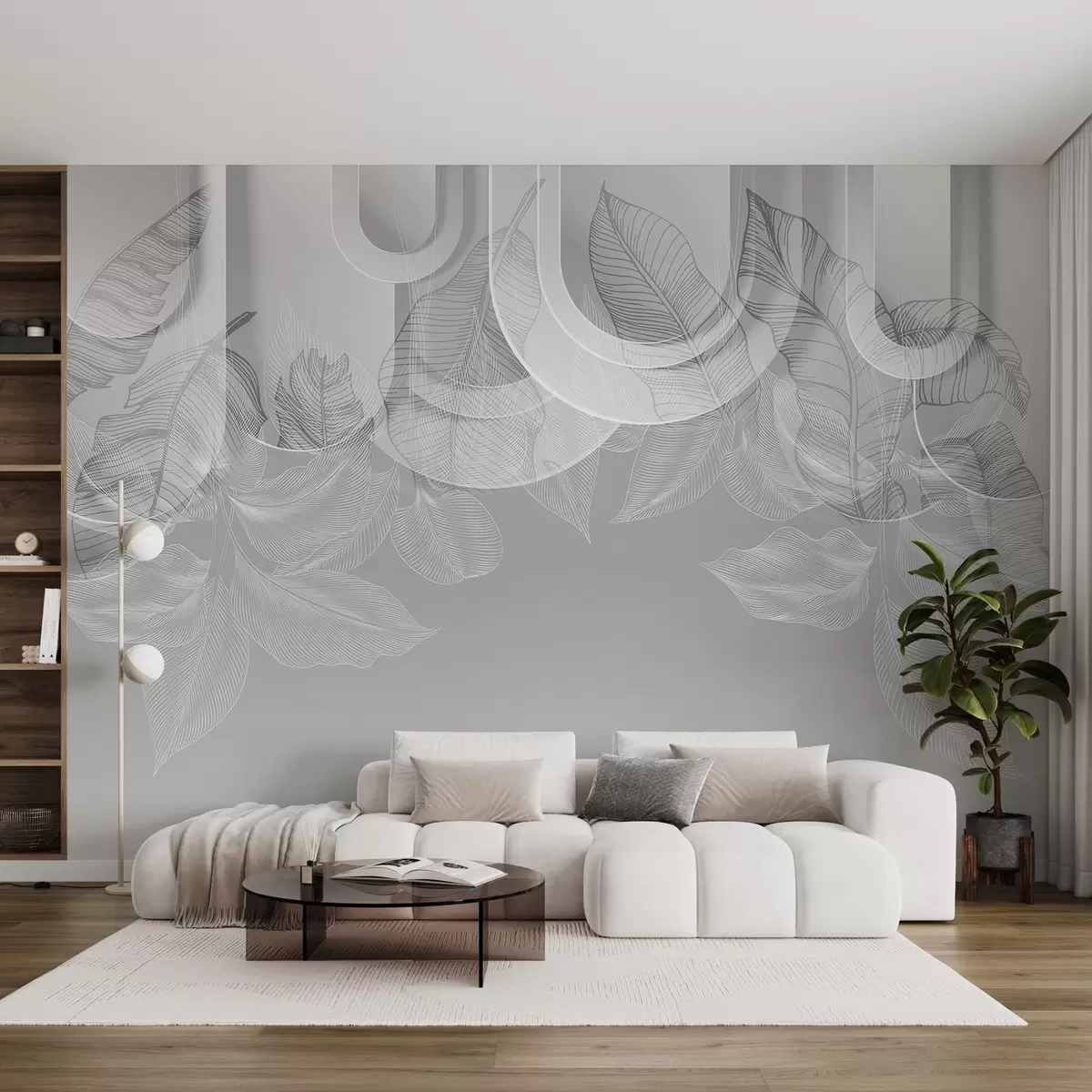 Murais de parede Fundo abstrato com arcos cinzentos e folhas tropicais brancas, design minimalista, elegante e moderno, paleta de cores neutras Nr. w09138