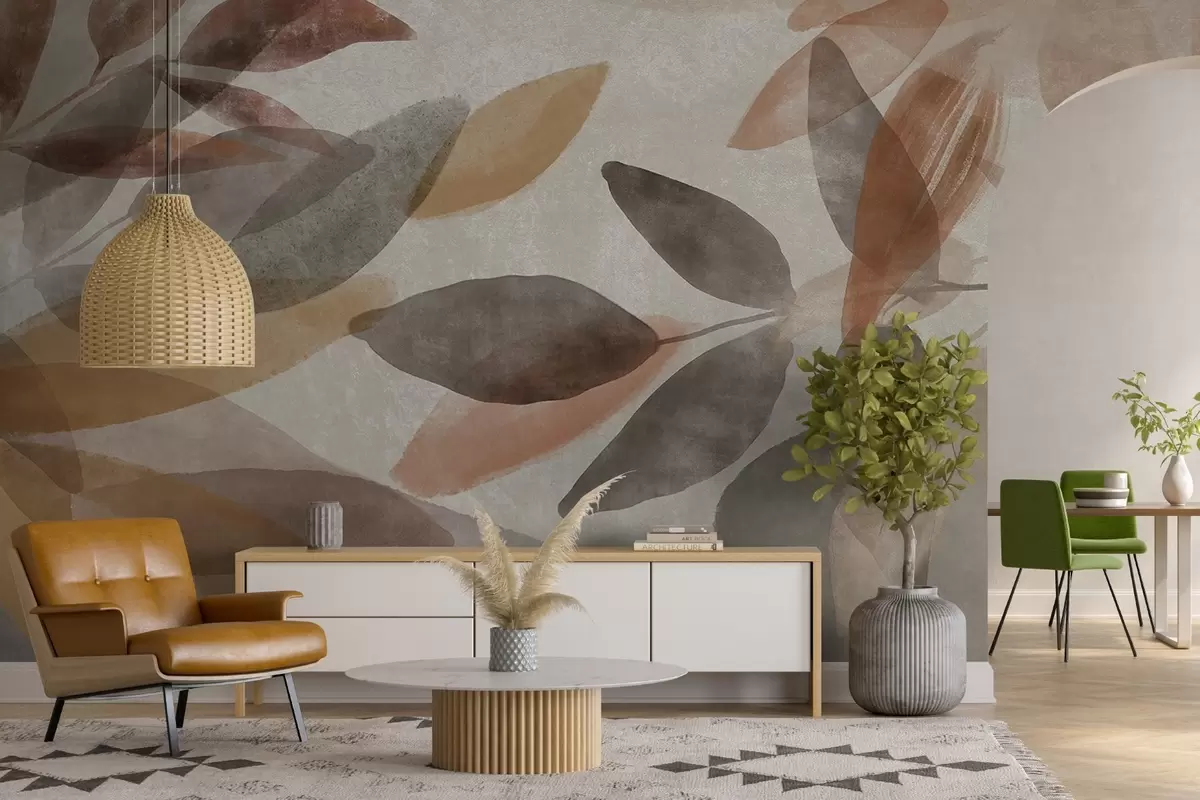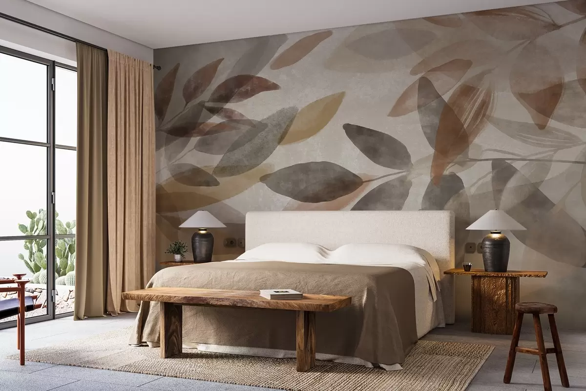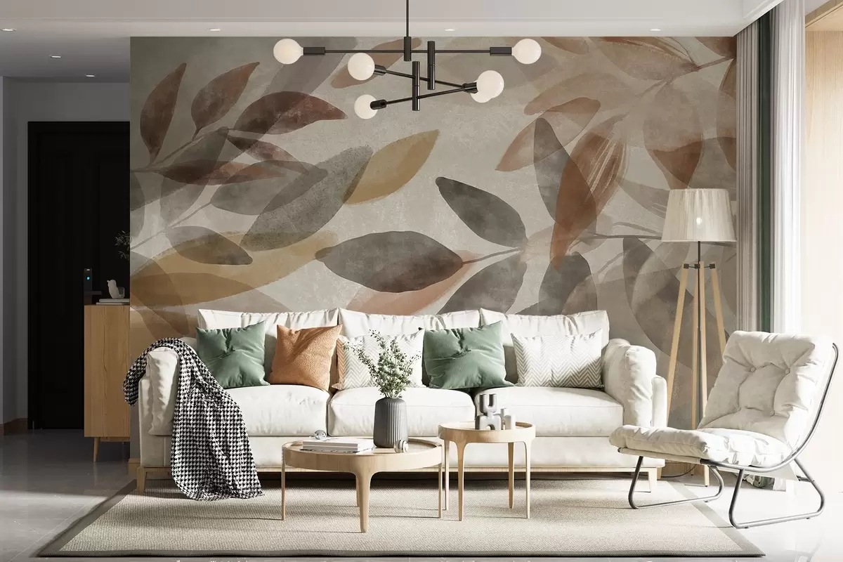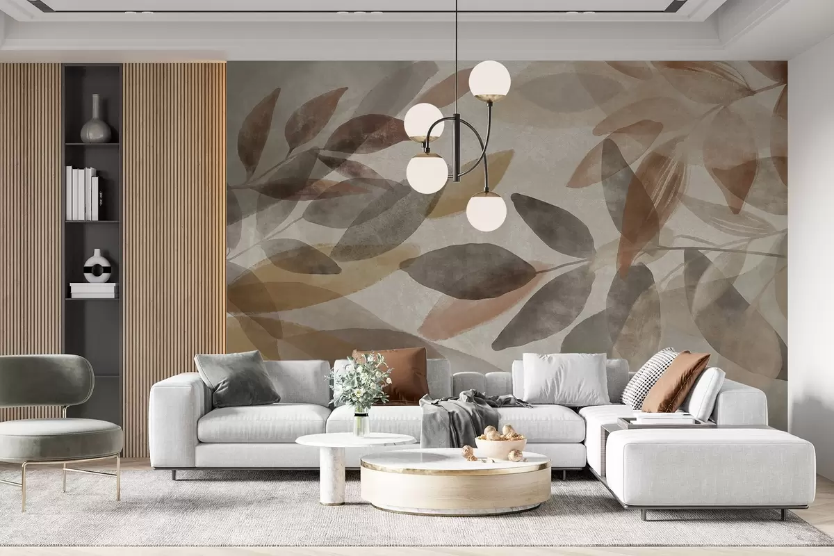 Murais de parede Folhas abstractas texturadas em tons suaves de castanho, bege e cinzento, formas transparentes, estilo minimalista, formas orgânicas Nr. w09140