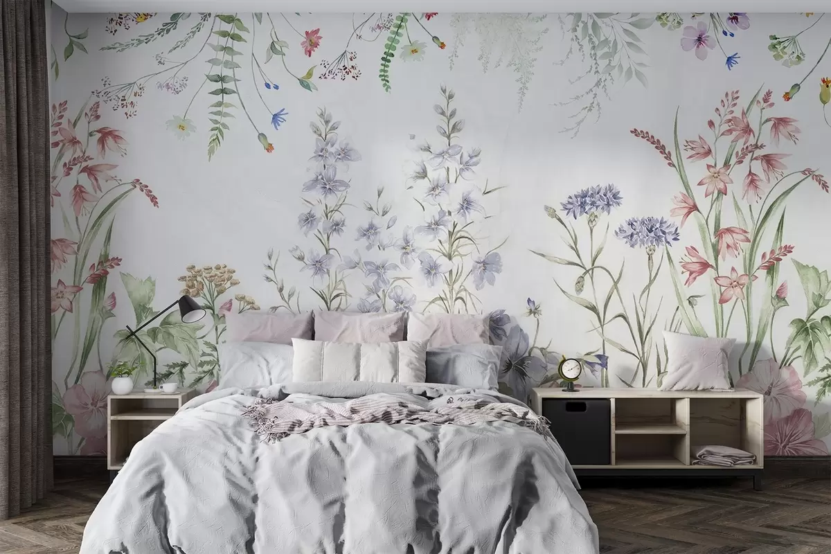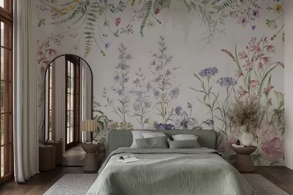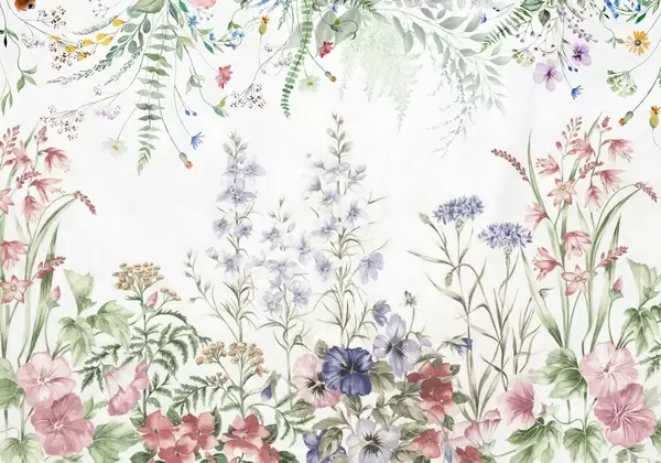 Murais de parede Arranjo floral textural com flores coloridas e folhas verdes, ilustração botânica, cores pastel suaves, estilo vintage Nr. w09143