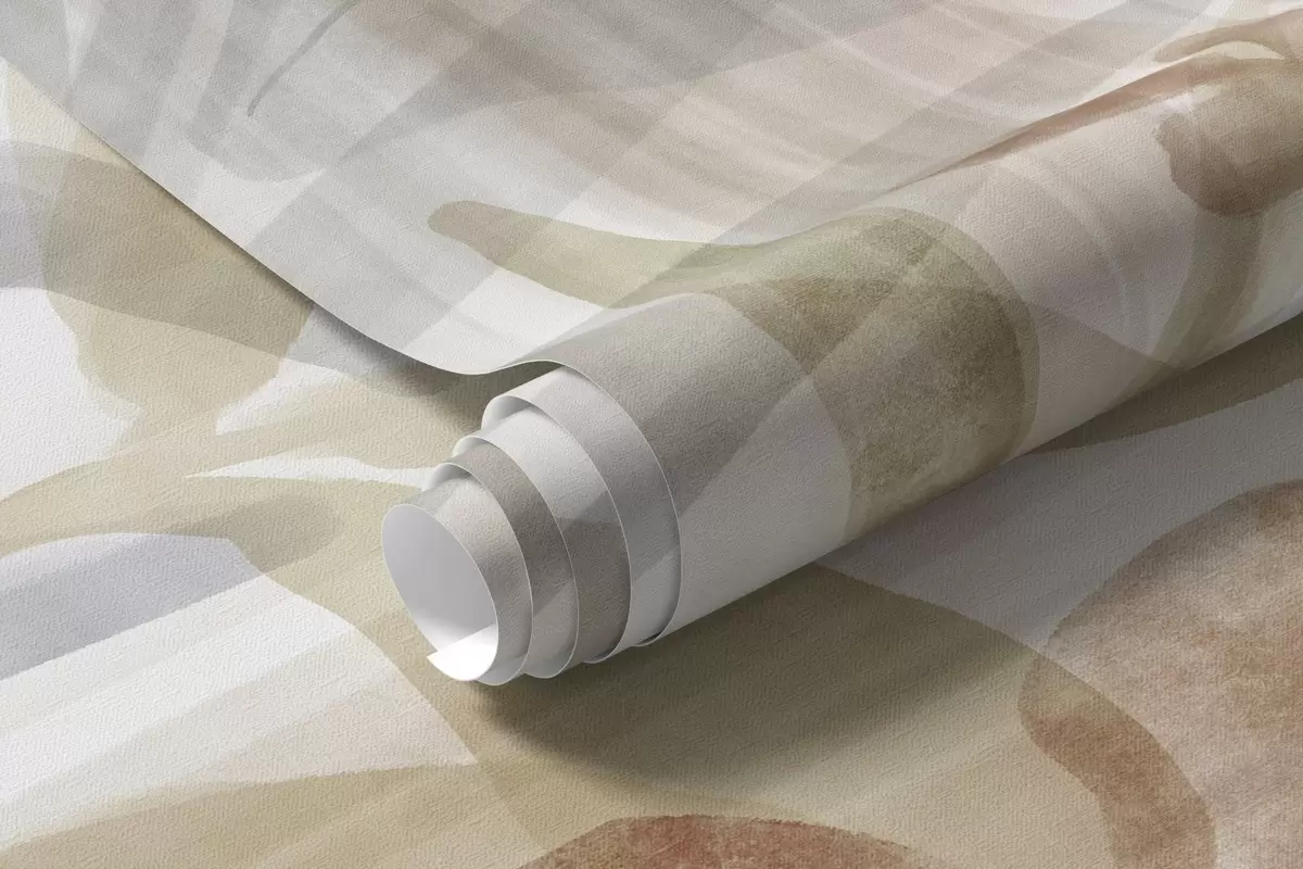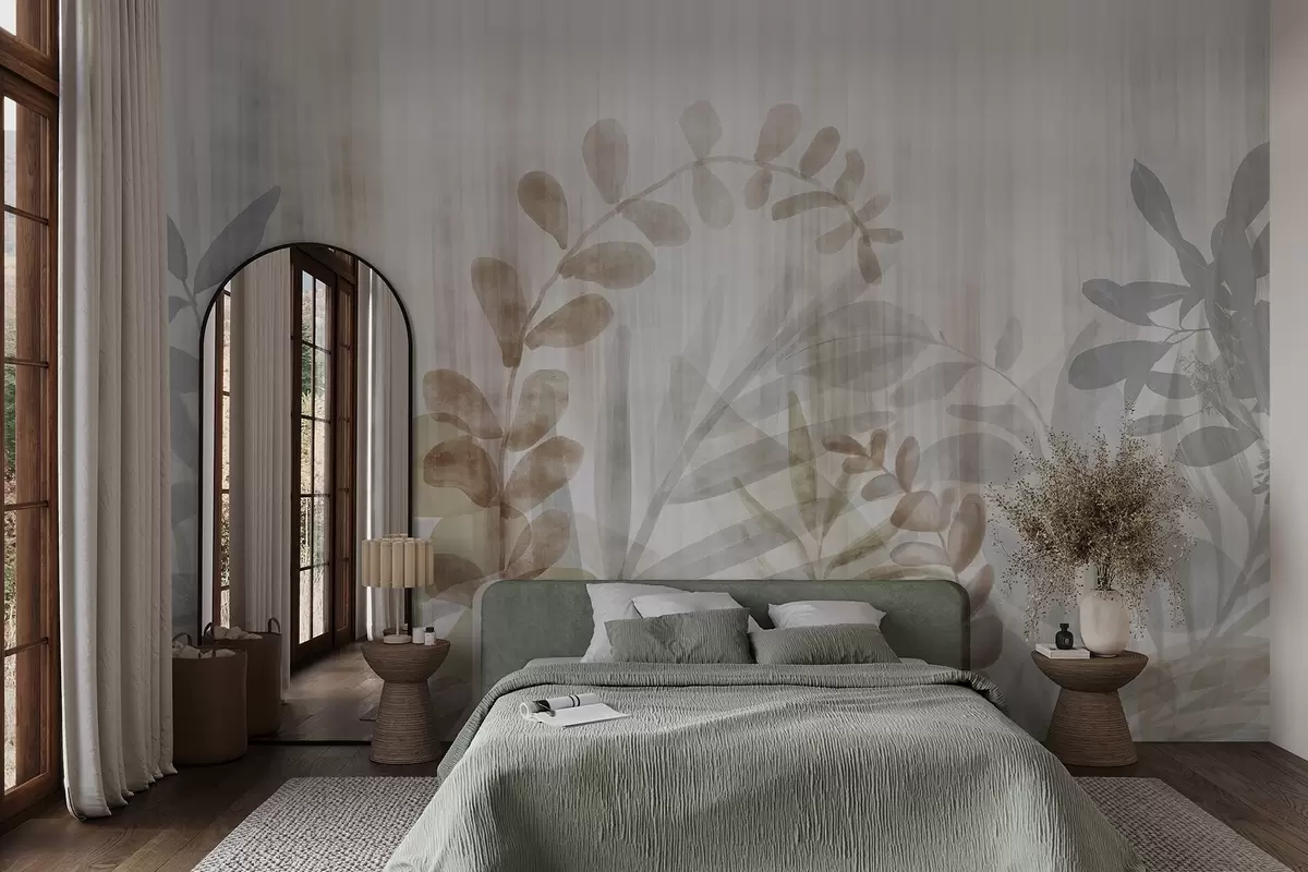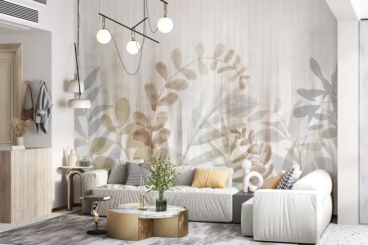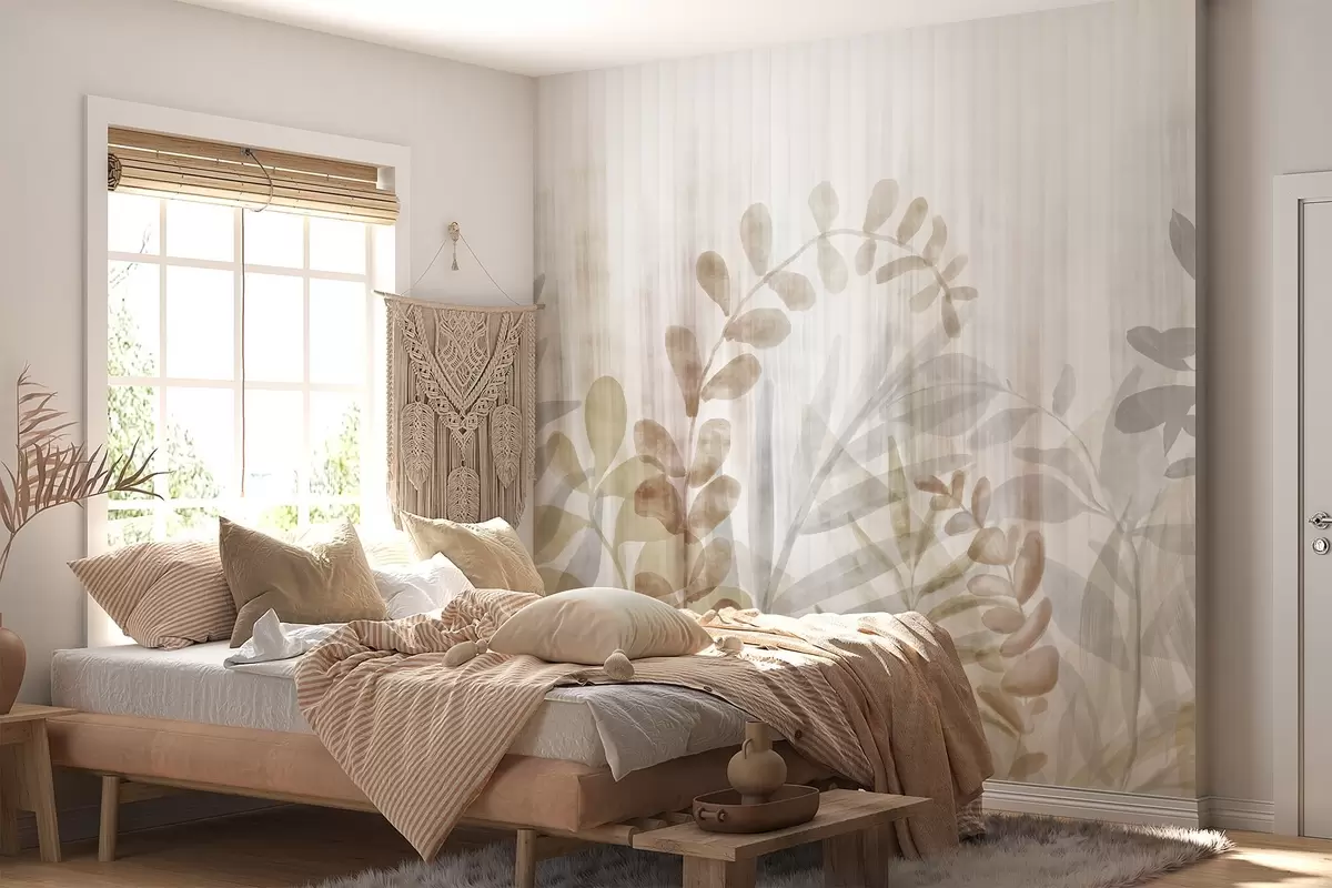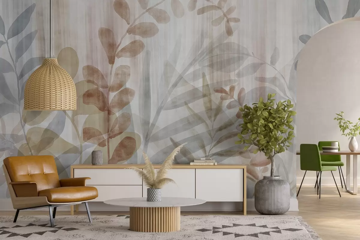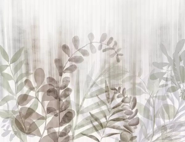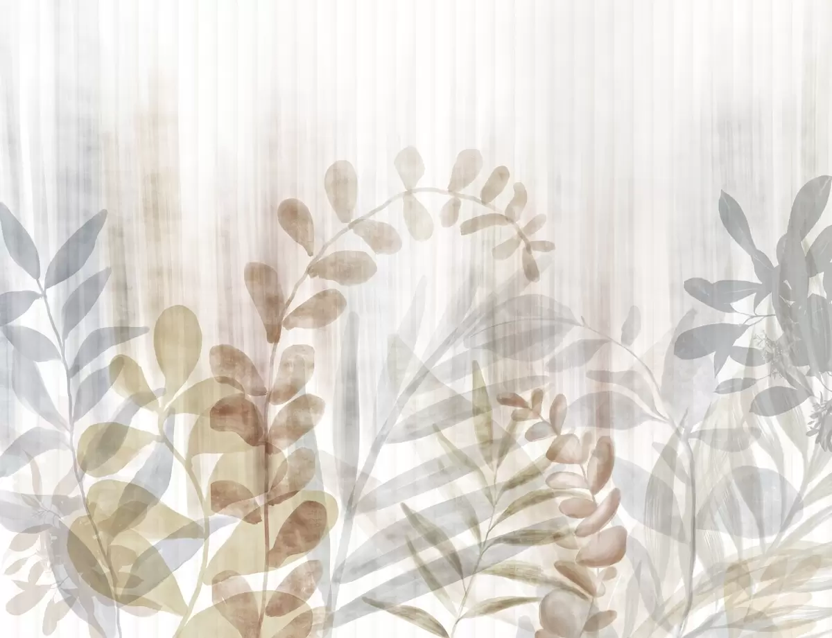 Murais de parede Pintura a aguarela imitação de plantas com folhas multicoloridas e suaves, fundo claro com linhas verticais, ilustração botânica Nr. w09146