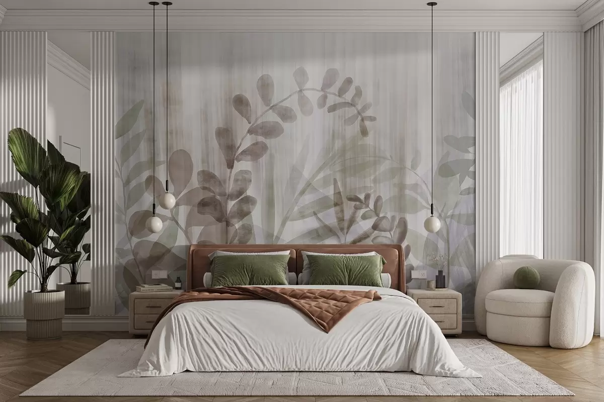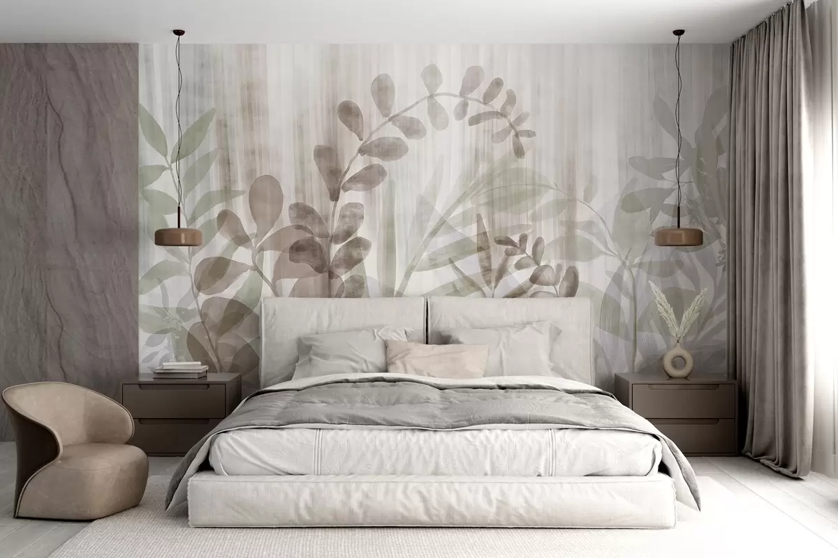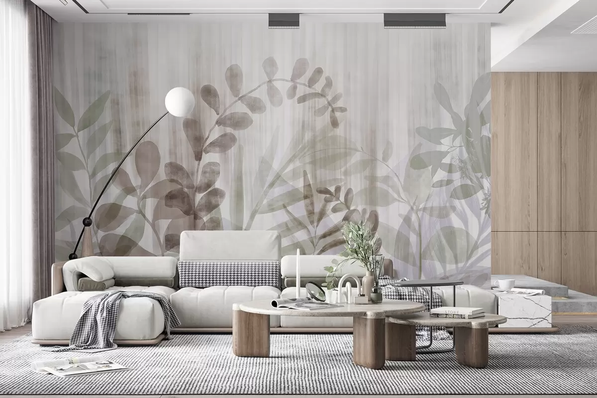 Murais de parede Pintura a aguarela imitação de plantas com folhas multicoloridas e suaves, fundo claro com linhas verticais, ilustração botânica Nr. w09146v1