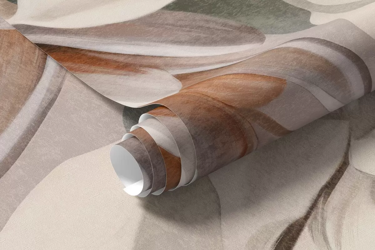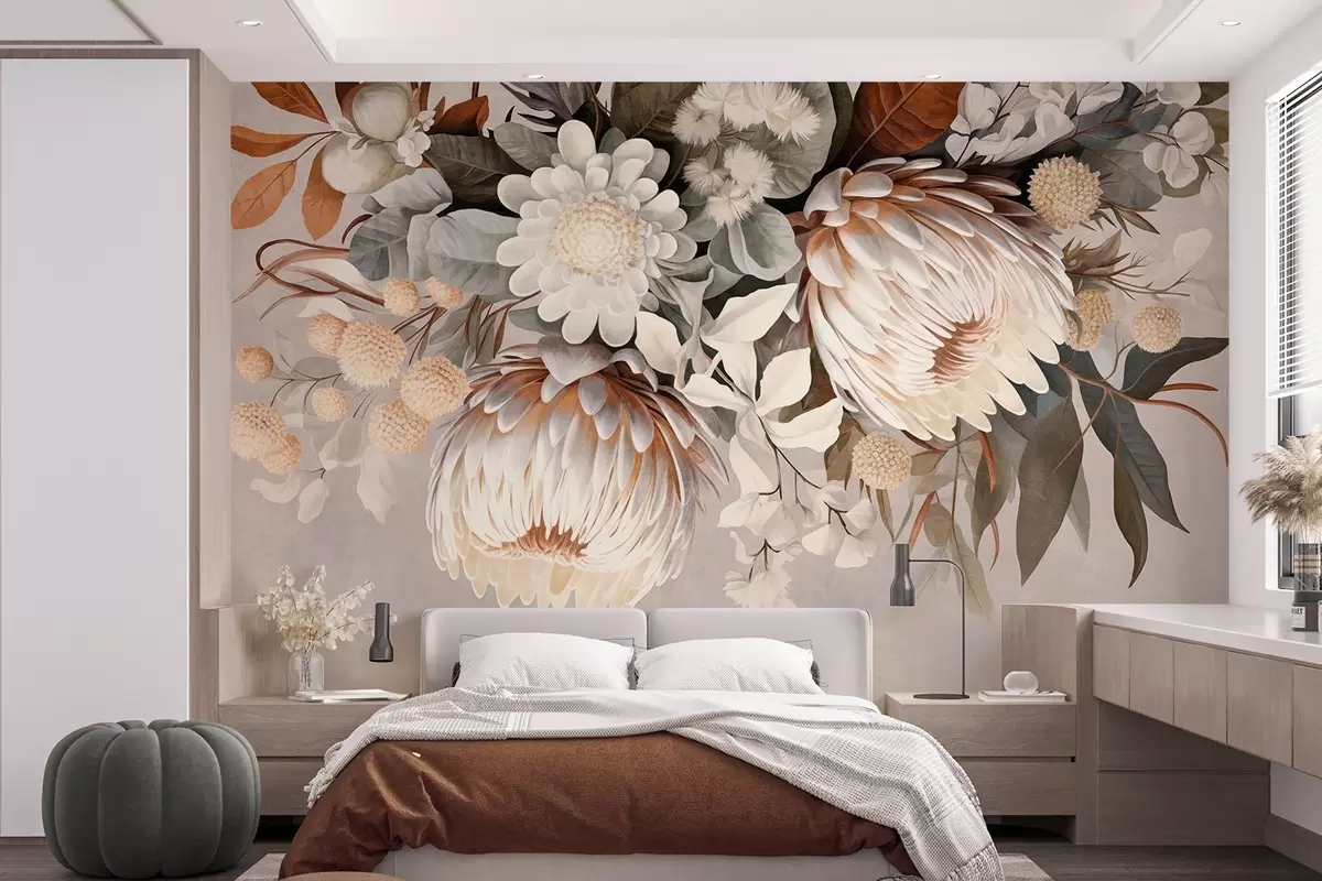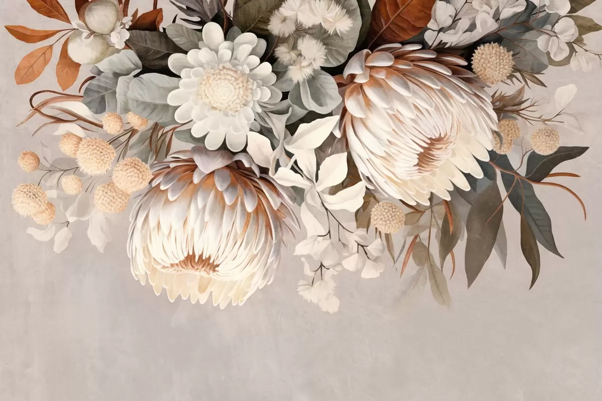 Murais de parede Grande protea texturizada com toques castanhos, margaridas brancas e flores amarelas, fundo bege suave Nr. w09157