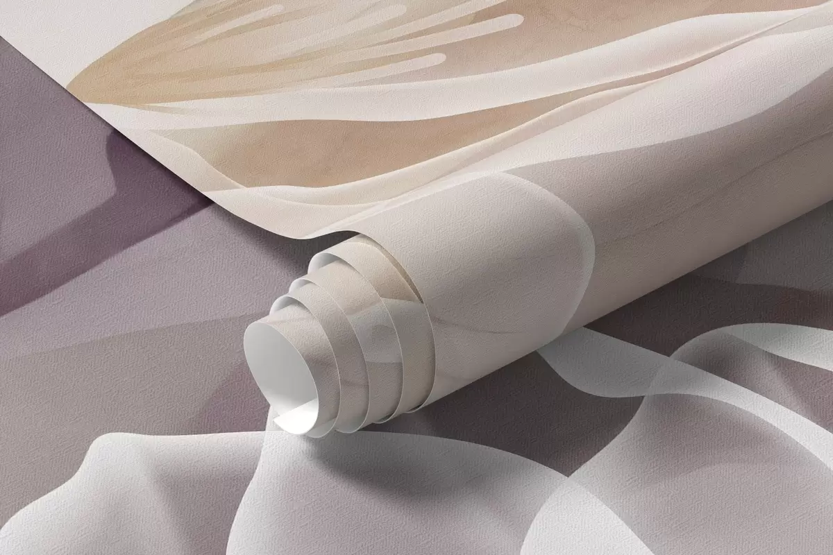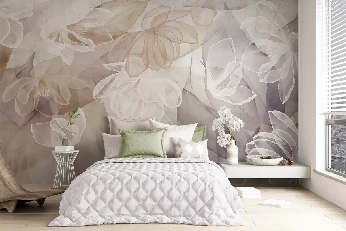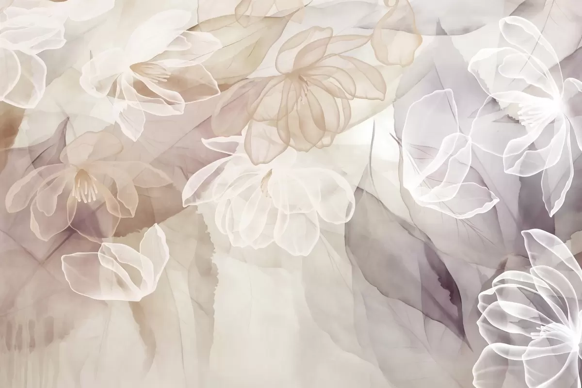 Murais de parede Flores e folhas com pétalas transparentes em tons de branco, bege e roxo, suaves e delicadas Nr. w09158