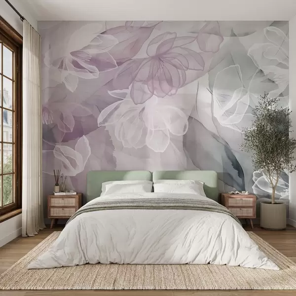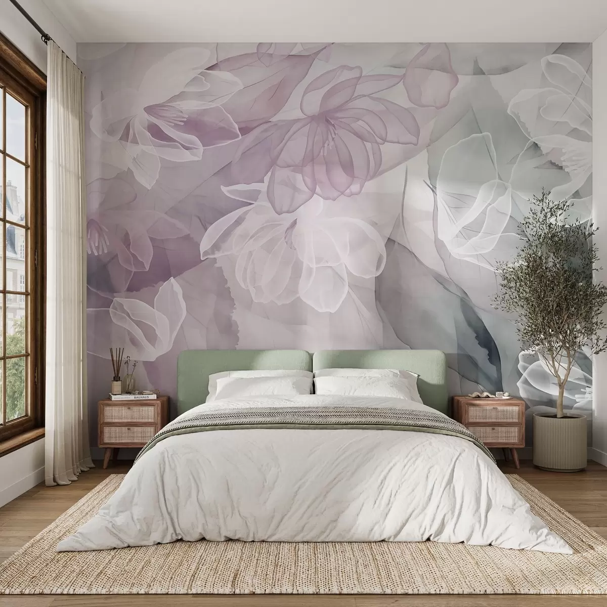 Murais de parede Flores e folhas com pétalas transparentes em tons de branco, rosa e verde, suaves e delicadas Nr. w09158v1