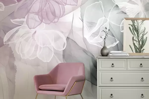 Murais de parede Flores e folhas com pétalas transparentes em tons de branco, rosa e verde, suaves e delicadas Nr. w09158v1