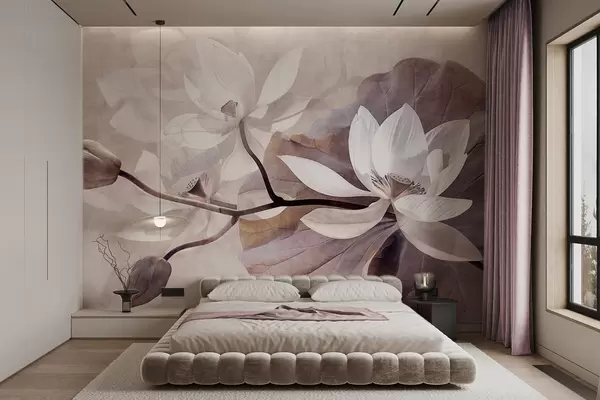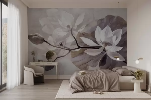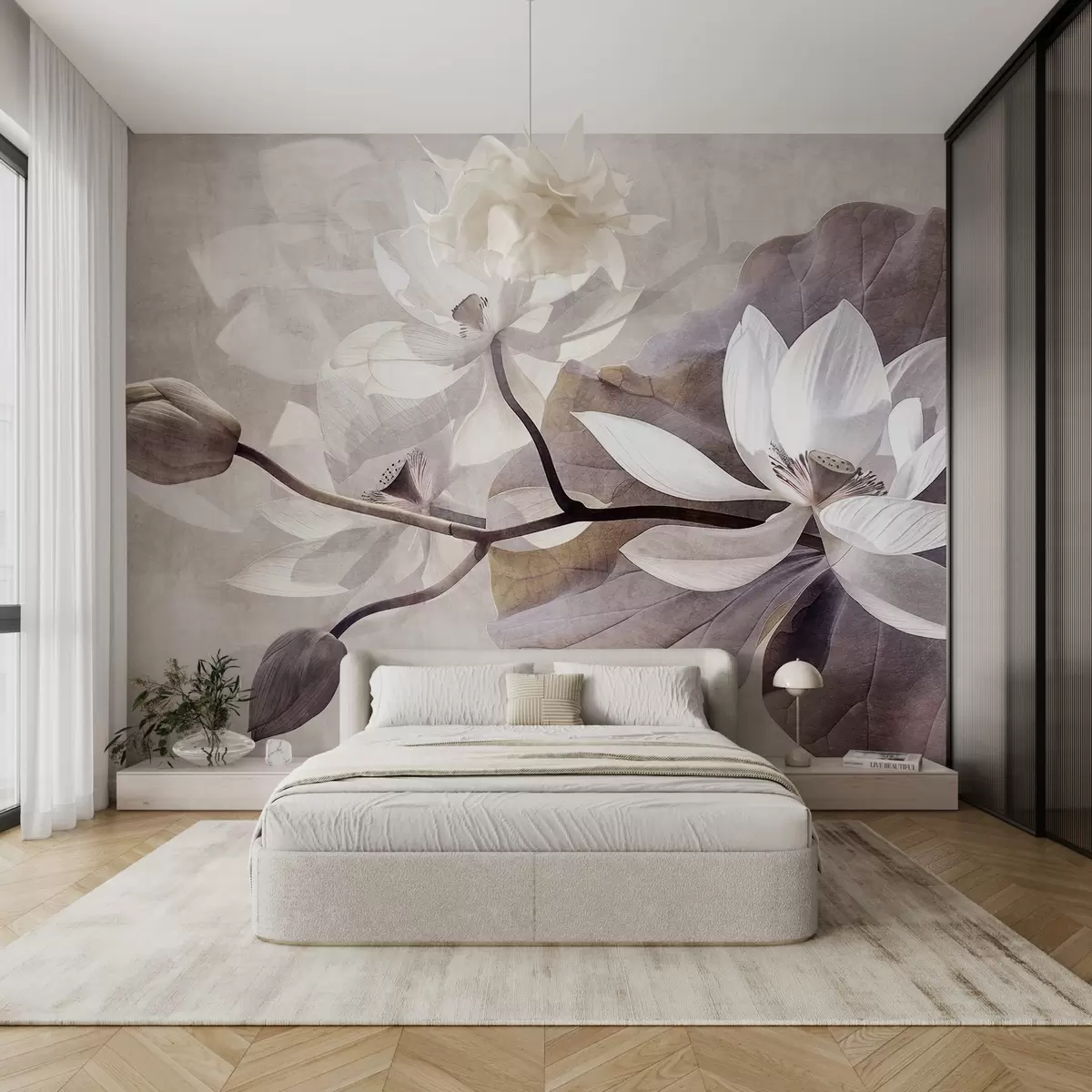 Murais de parede Flores de lótus delicadas, com textura granulada e suave, com folhas e caules numa paleta de cores bege suave Nr. w09159
