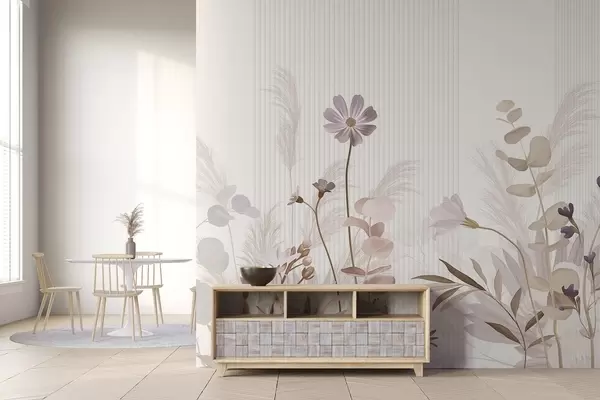 Murais de parede Flores em tons pastel, folhas castanhas claras, fundo branco com linhas verticais, elegante e minimalista Nr. w09161