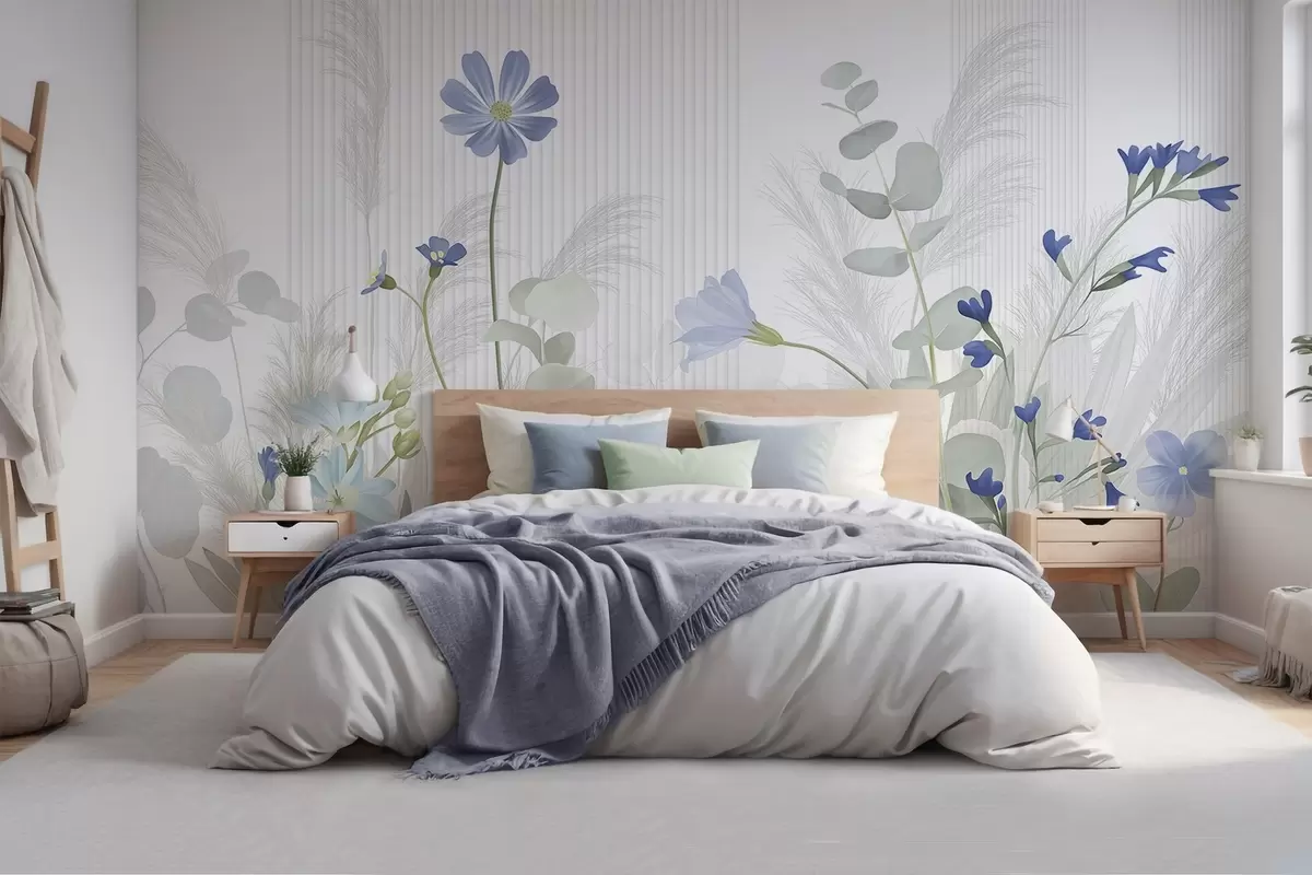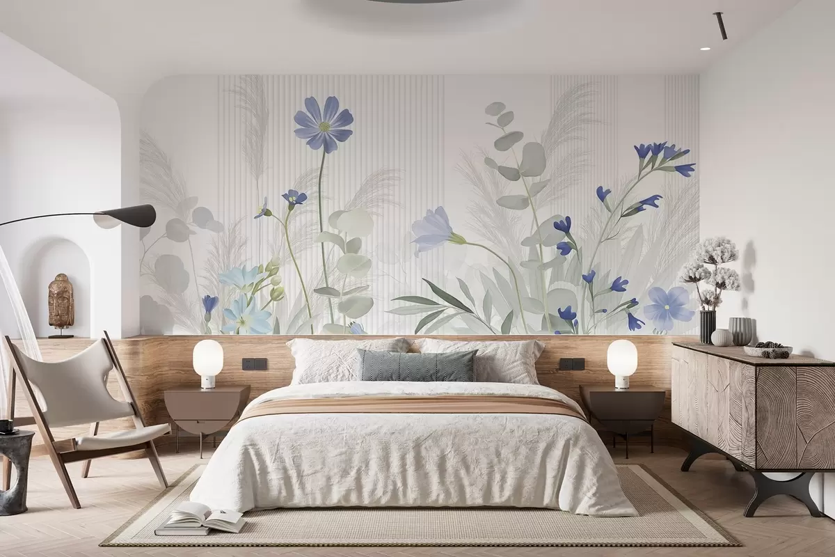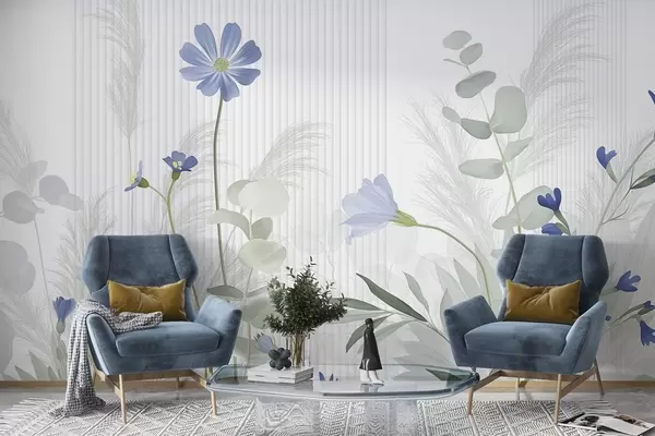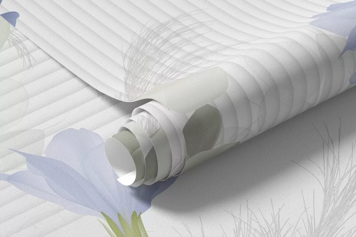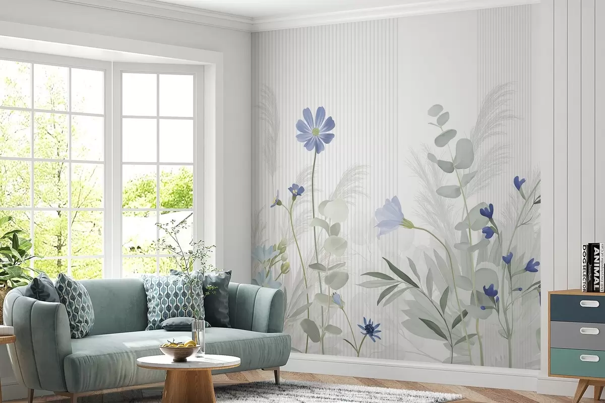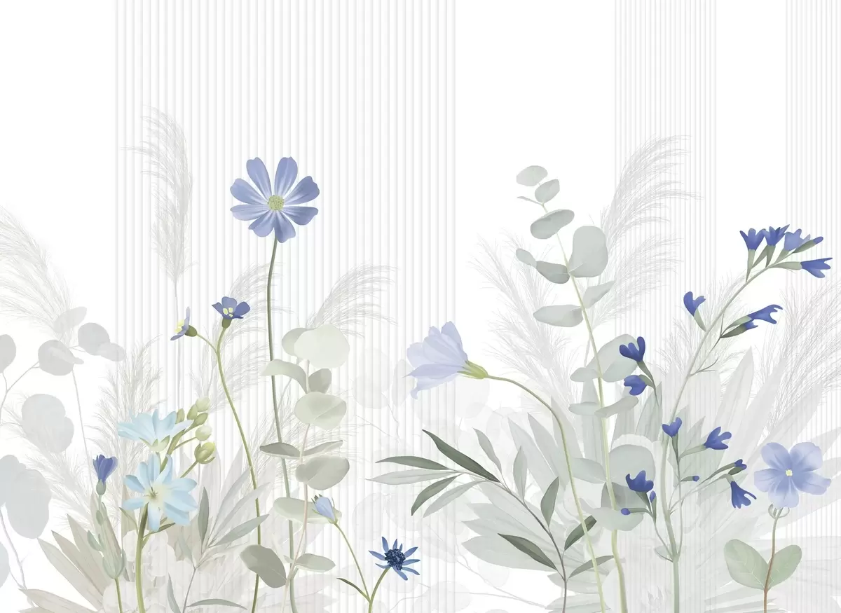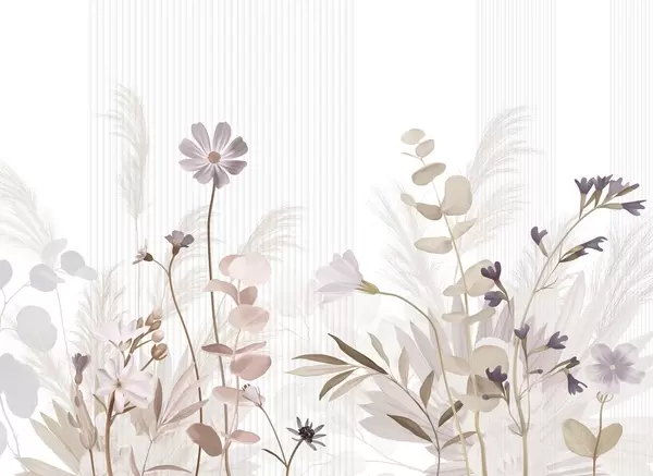 Murais de parede Flores em tons pastel, folhas verdes claras, fundo branco com linhas verticais, elegante e minimalista Nr. w09161v1