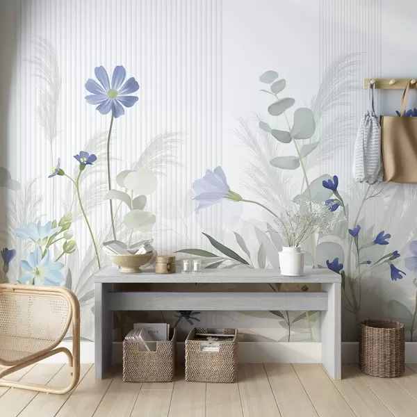 Murais de parede Flores em tons pastel, folhas verdes claras, fundo branco com linhas verticais, elegante e minimalista Nr. w09161v1