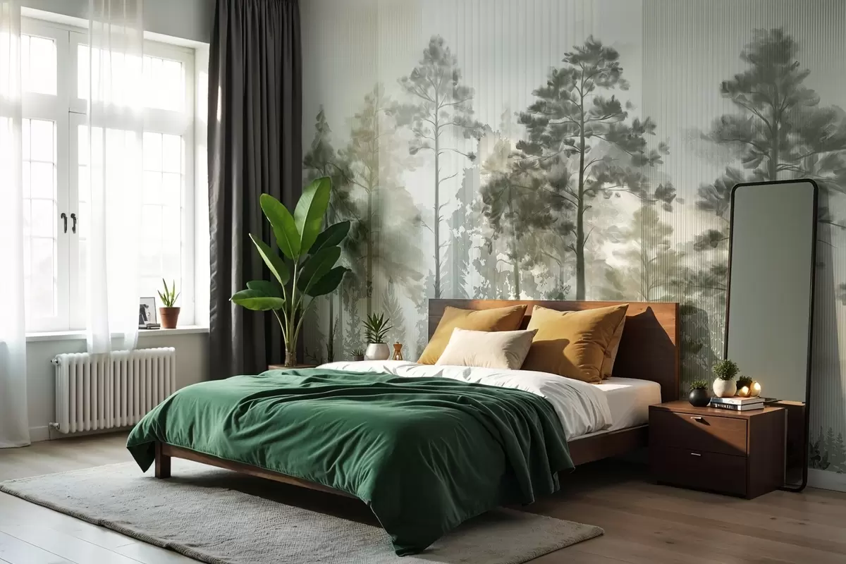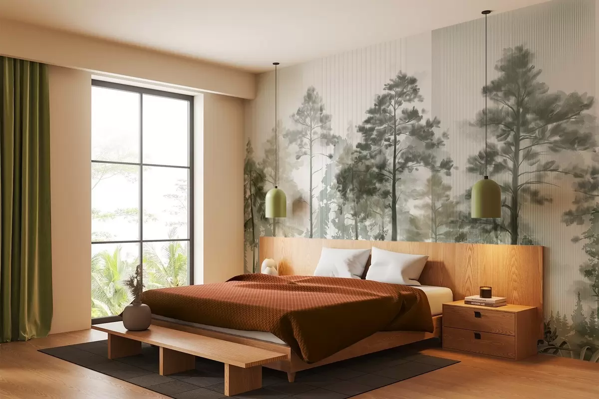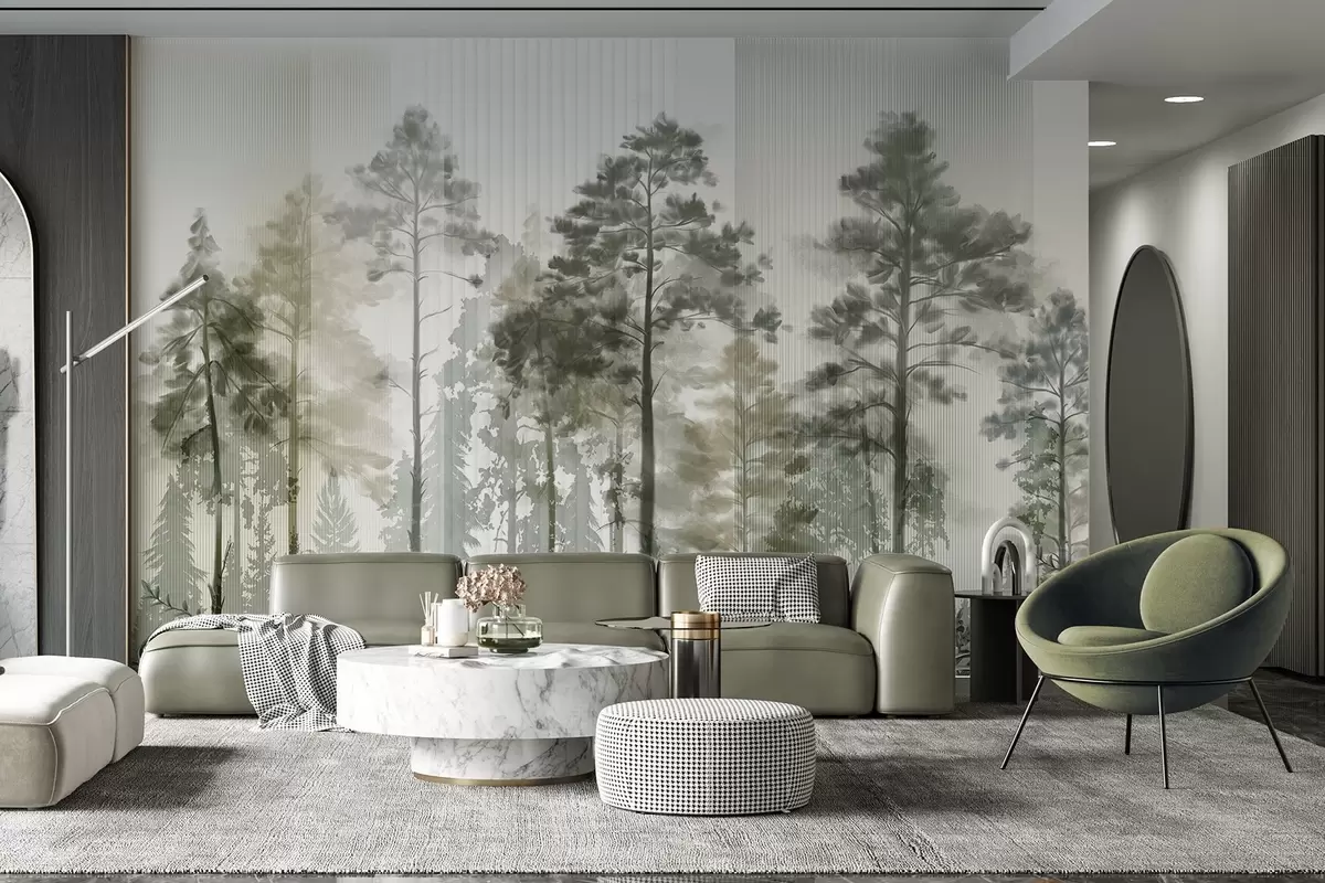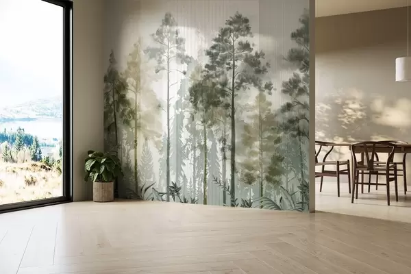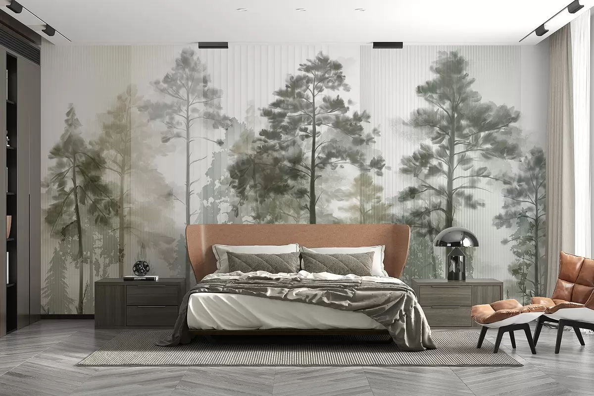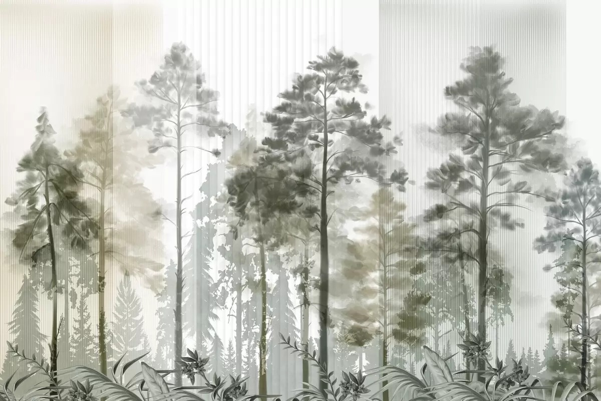 Murais de parede Uma floresta densa com pinheiros altos, folhagem verde exuberante, uma atmosfera enevoada com texturas de linhas verticais Nr. w09163