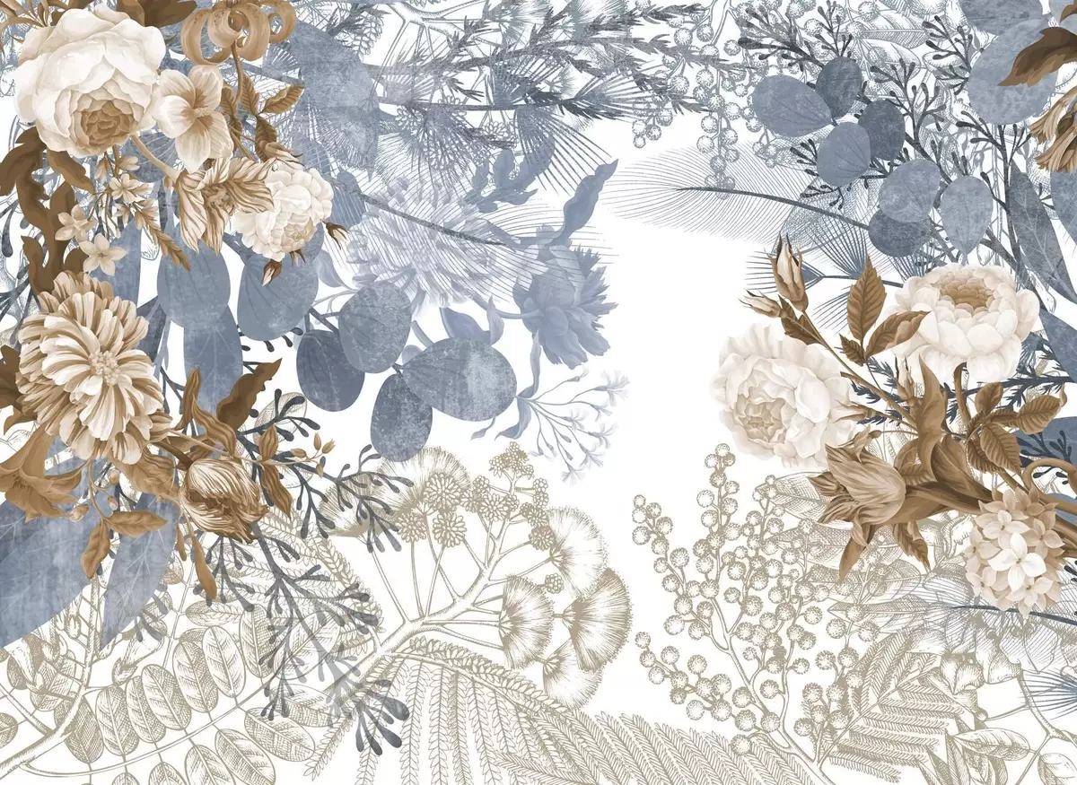 Murais de parede Arranjo floral vintage com rosas, eucalipto e mimosa em tons de azul e castanho Nr. w09164