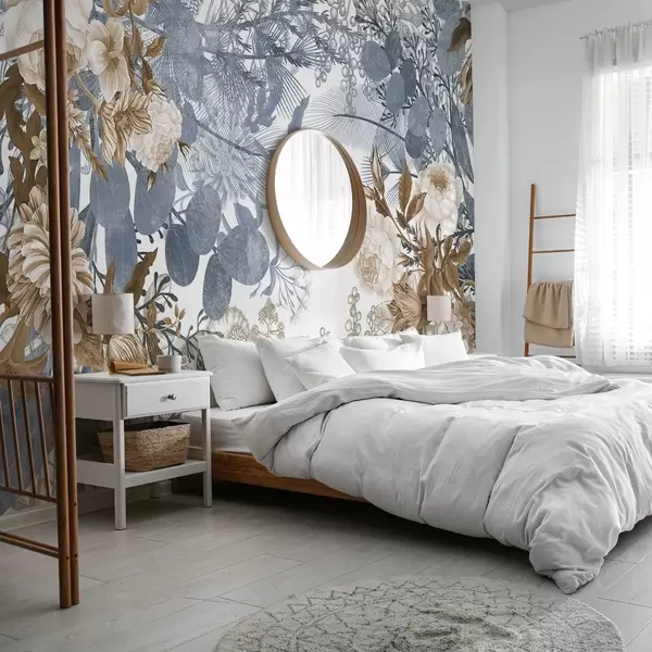 Murais de parede Arranjo floral vintage com rosas, eucalipto e mimosa em tons de azul e castanho Nr. w09164