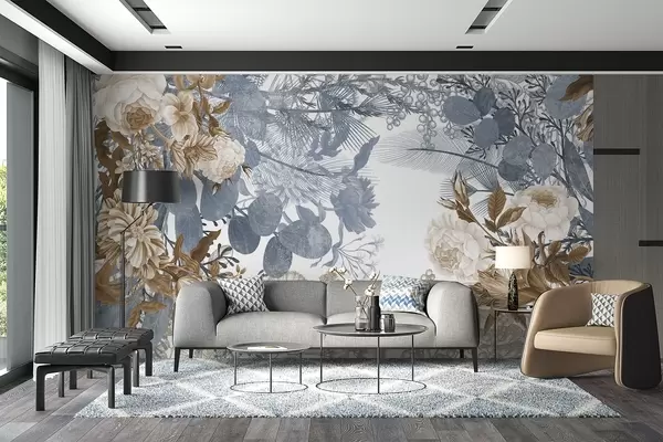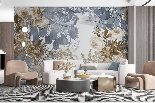 Murais de parede Arranjo floral vintage com rosas, eucalipto e mimosa em tons de azul e castanho Nr. w09164