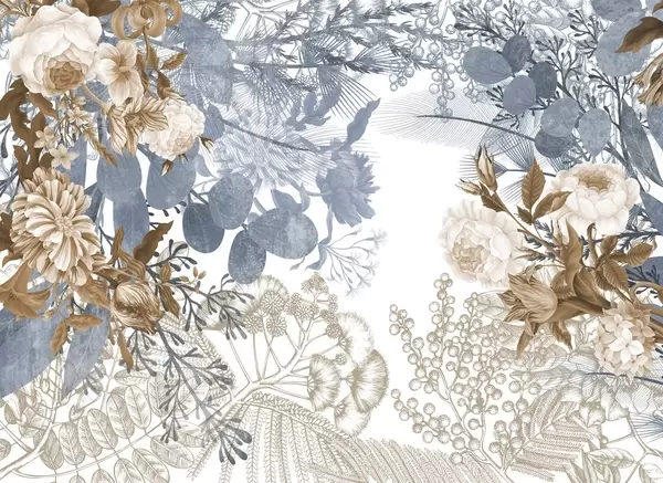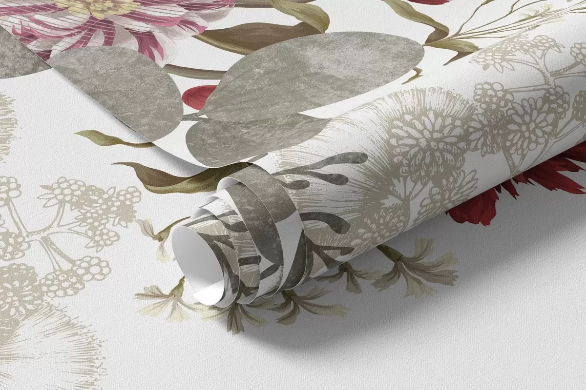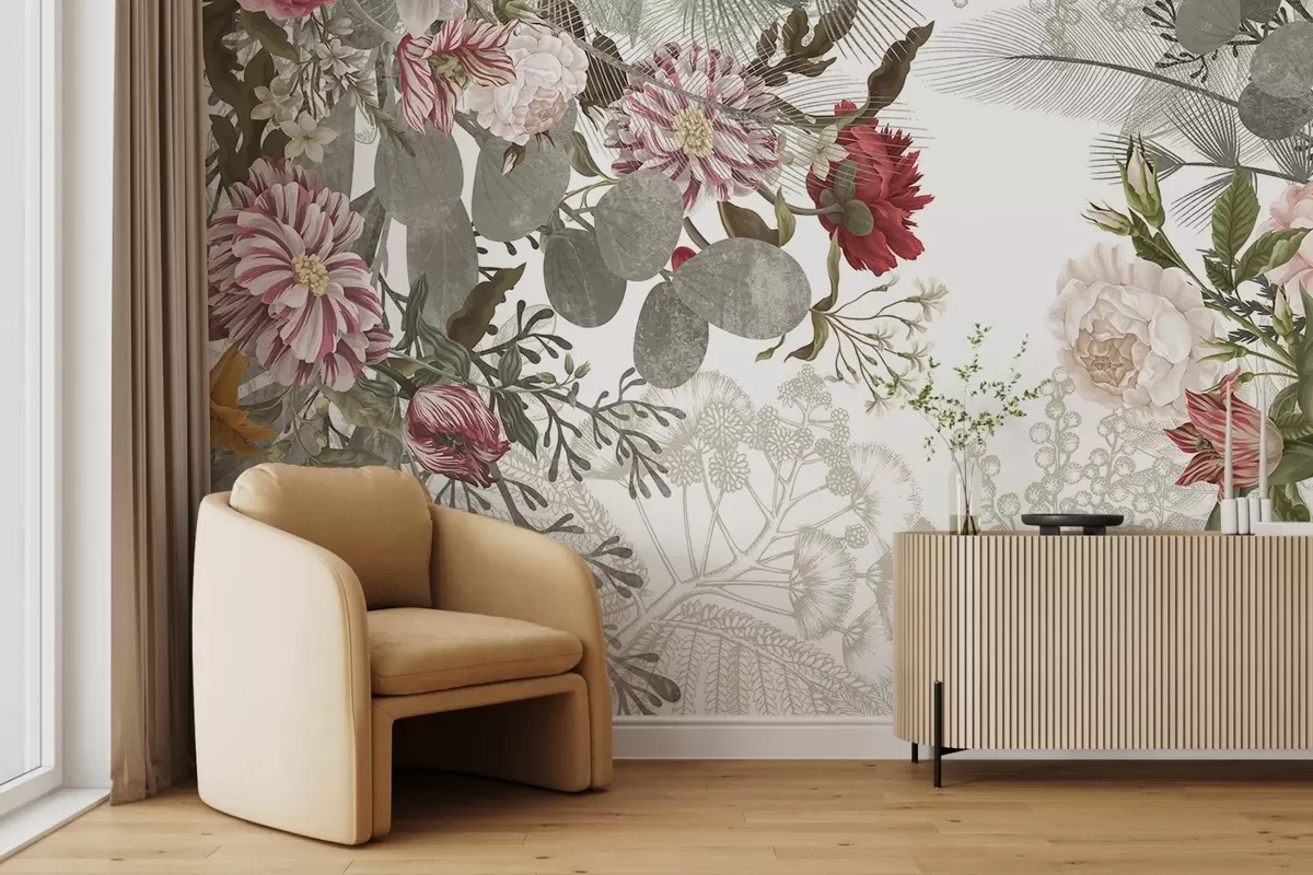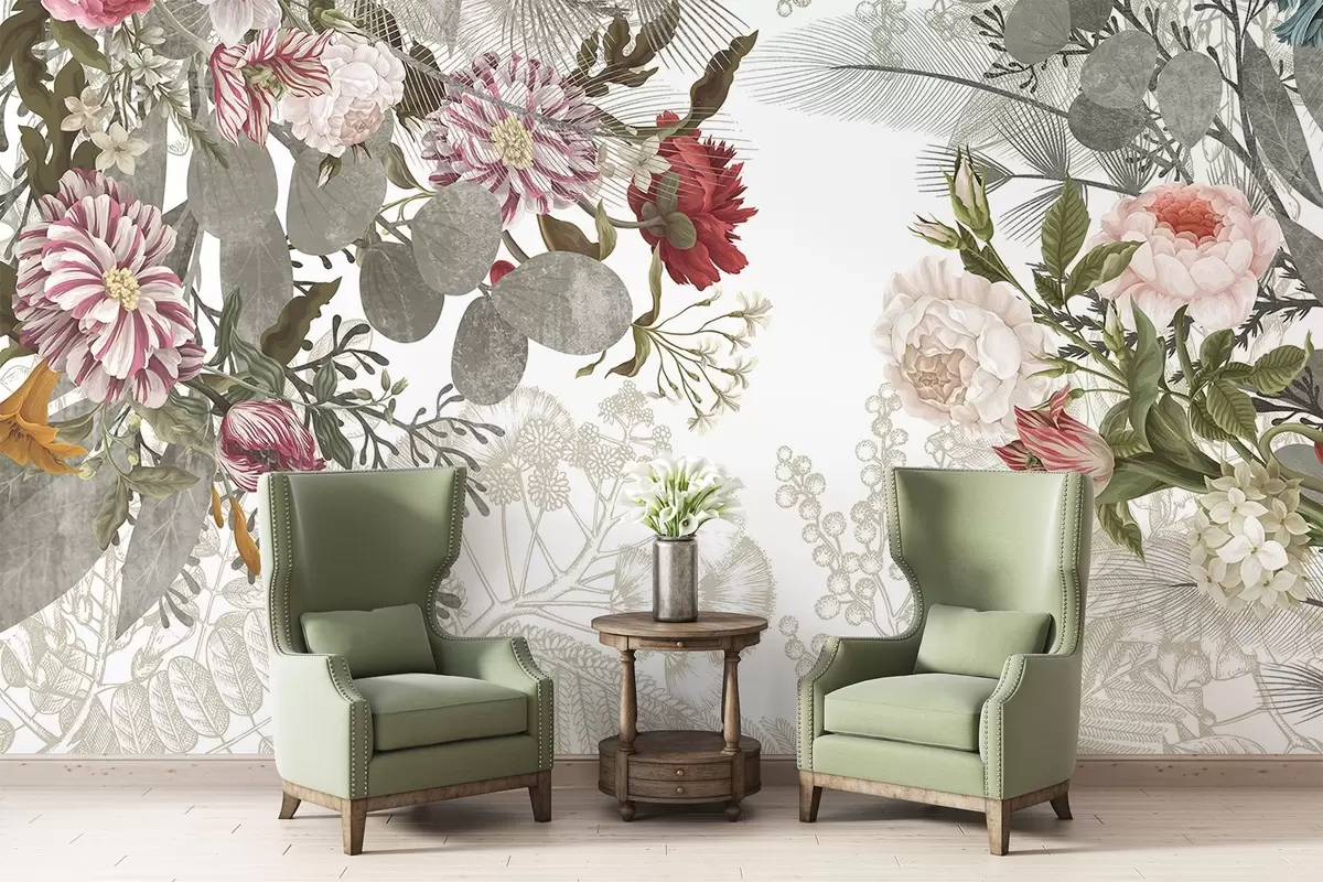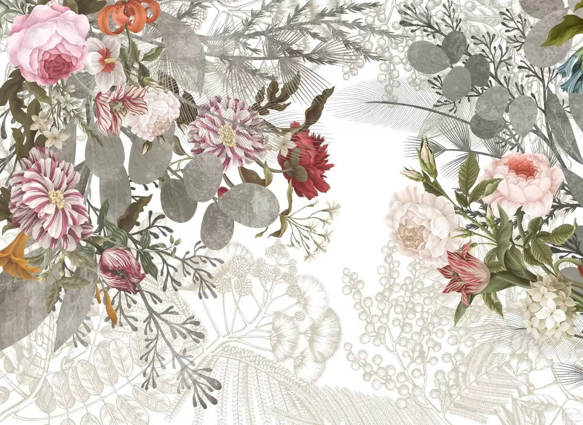 Murais de parede Arranjo floral vintage com rosas, eucalipto e mimosa em tons de verde suave, vermelho e cor-de-rosa Nr. w09164v1