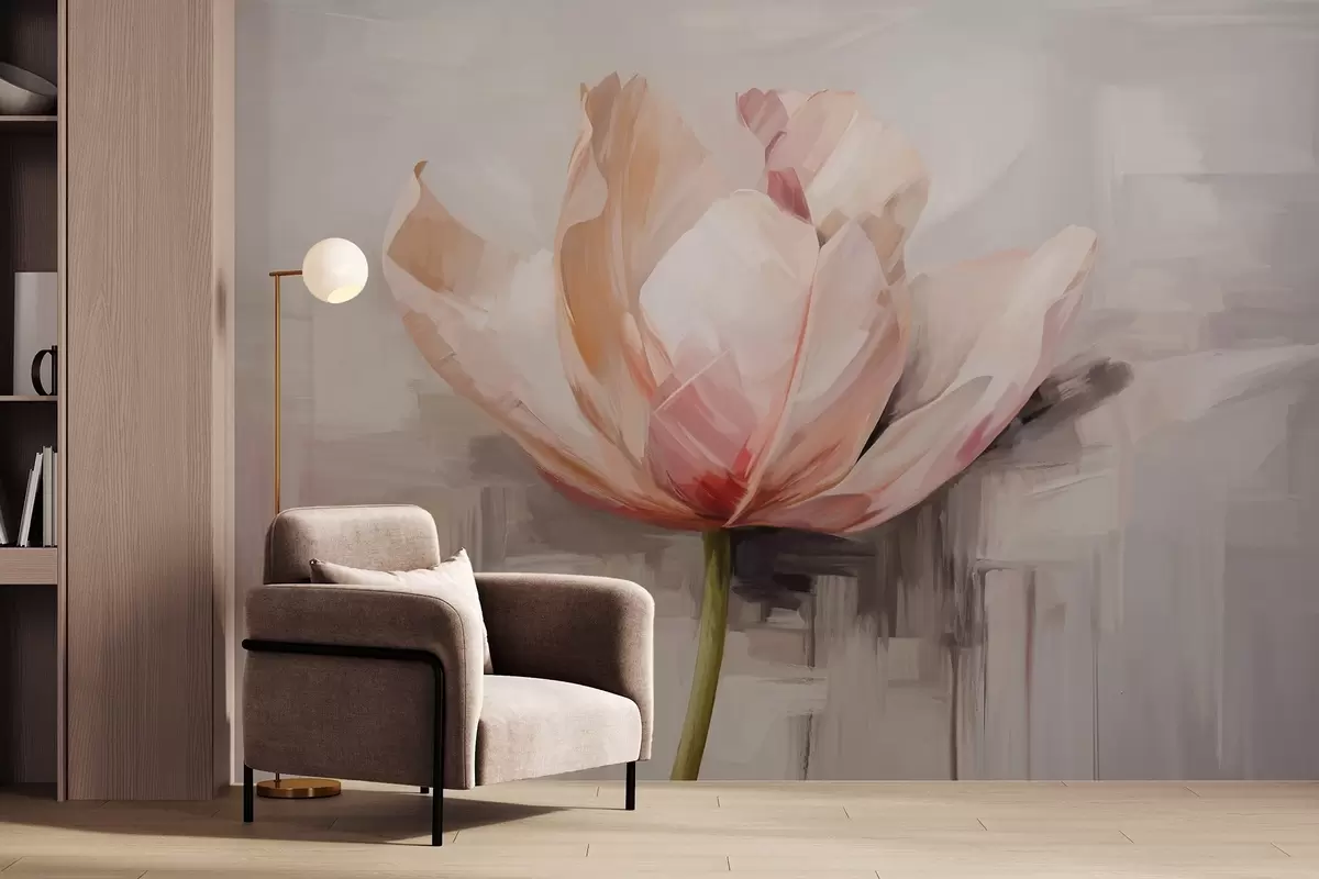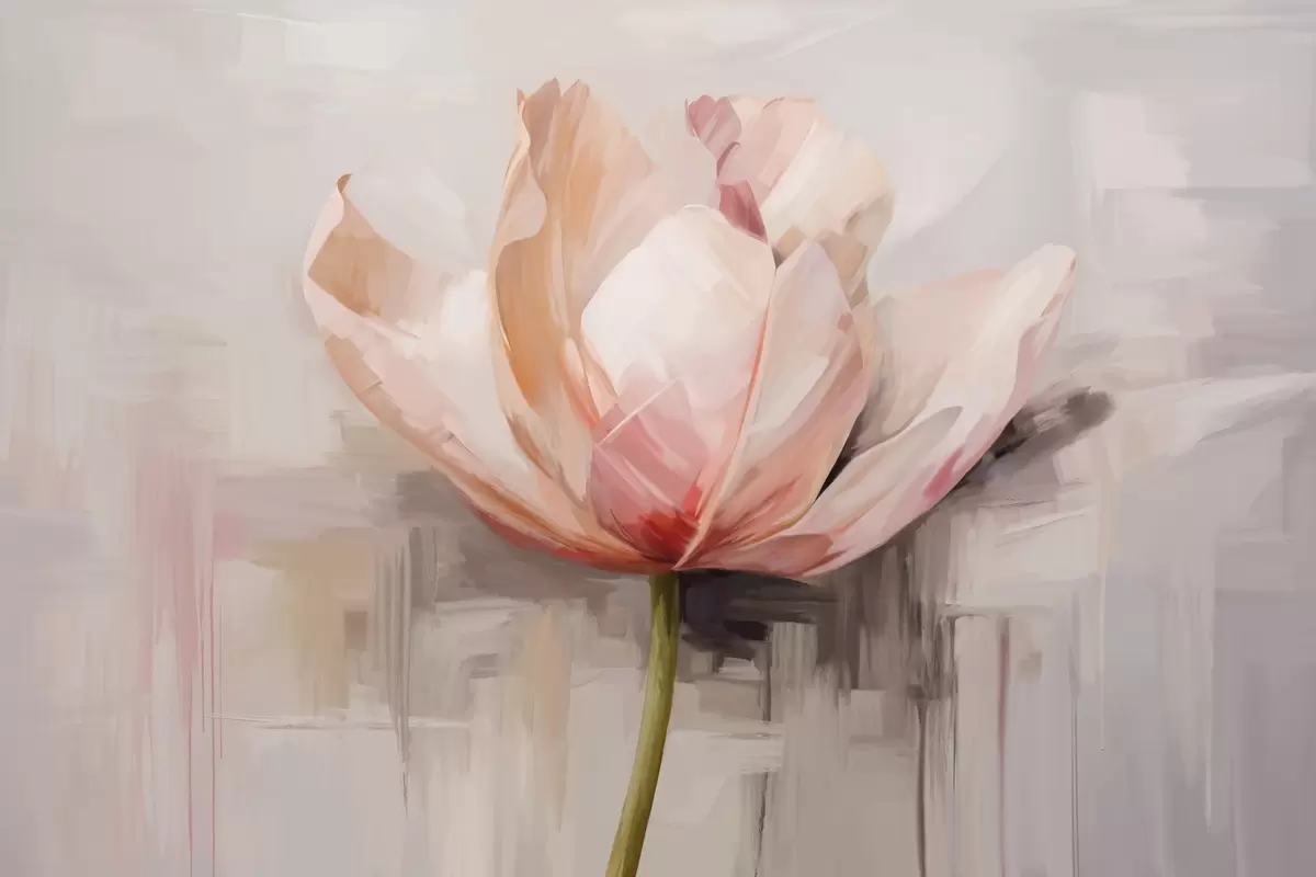 Murais de parede Tulipa cor-de-rosa, imitação de pintura a óleo com pinceladas suaves, fundo abstrato com tons pastel de cinzento e bege Nr. w09187