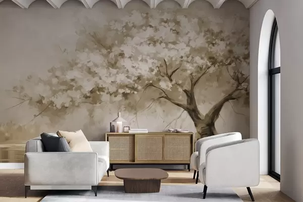 Murais de parede Árvore em flor bege abstrata em plena floração, junto a um rio, com pinceladas de textura suave e cores pastel Nr. w09193v1