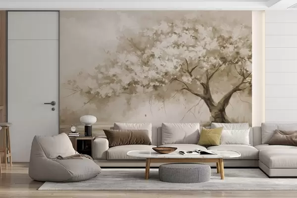 Murais de parede Árvore em flor bege abstrata em plena floração, junto a um rio, com pinceladas de textura suave e cores pastel Nr. w09193v1